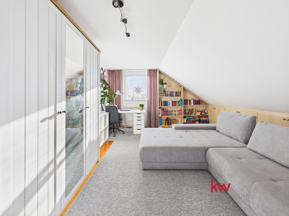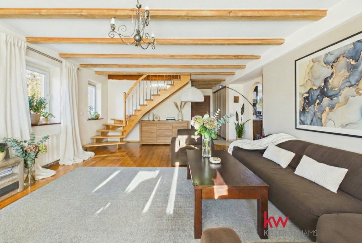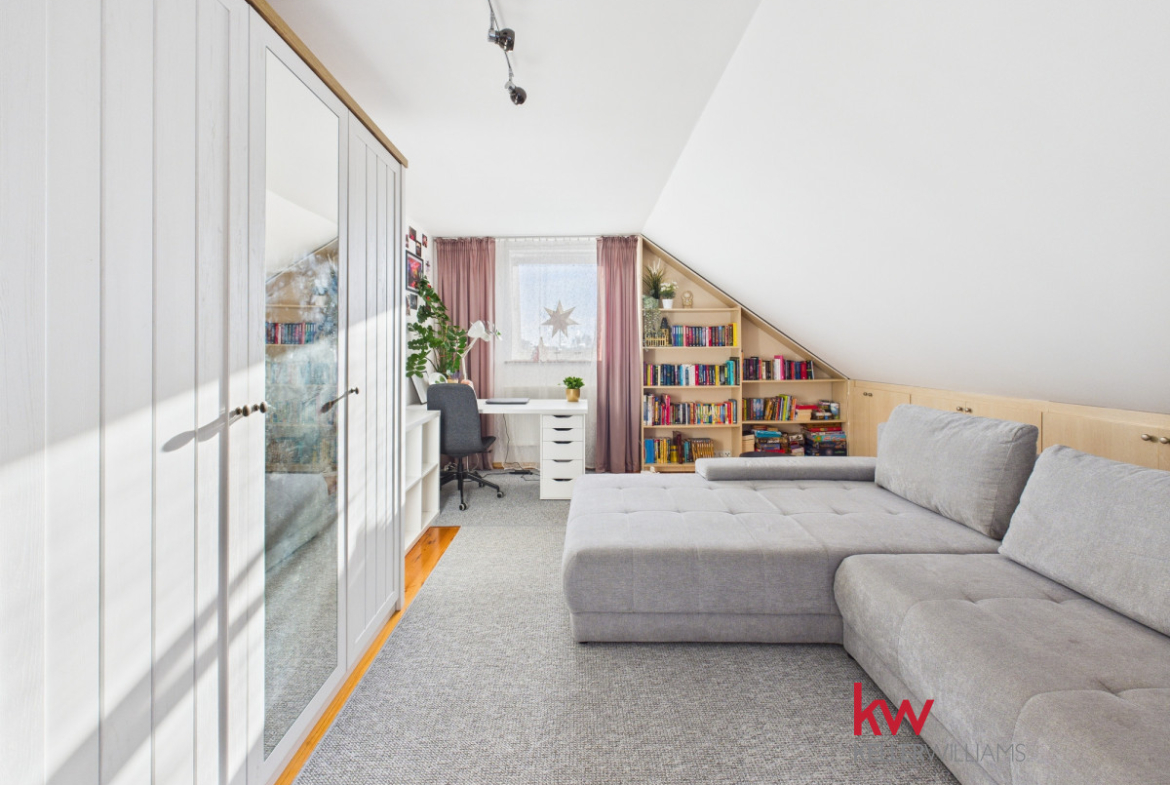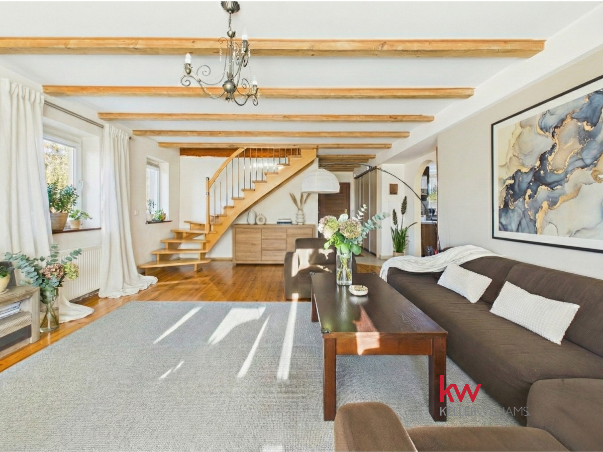Wnętrza są jasne i funkcjonalne, a duże pomieszczenia zapewniają komfort codziennego życia. Przestronny salon stanowi centralne miejsce domu, idealne do wspólnego spędzania czasu. Kuchnia jest wygodna i dobrze doświetlona, a liczne pokoje pozwalają na aranżację sypialni, gabinetu lub przestrzeni do pracy zdalnej.