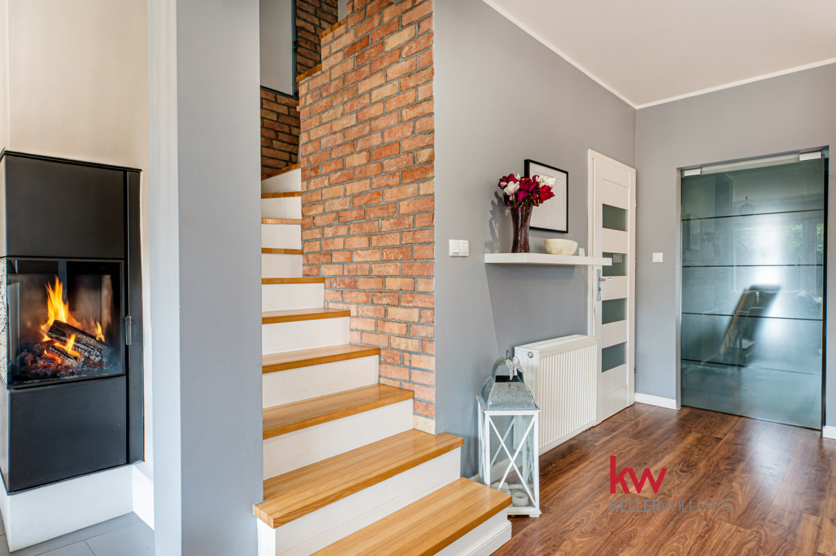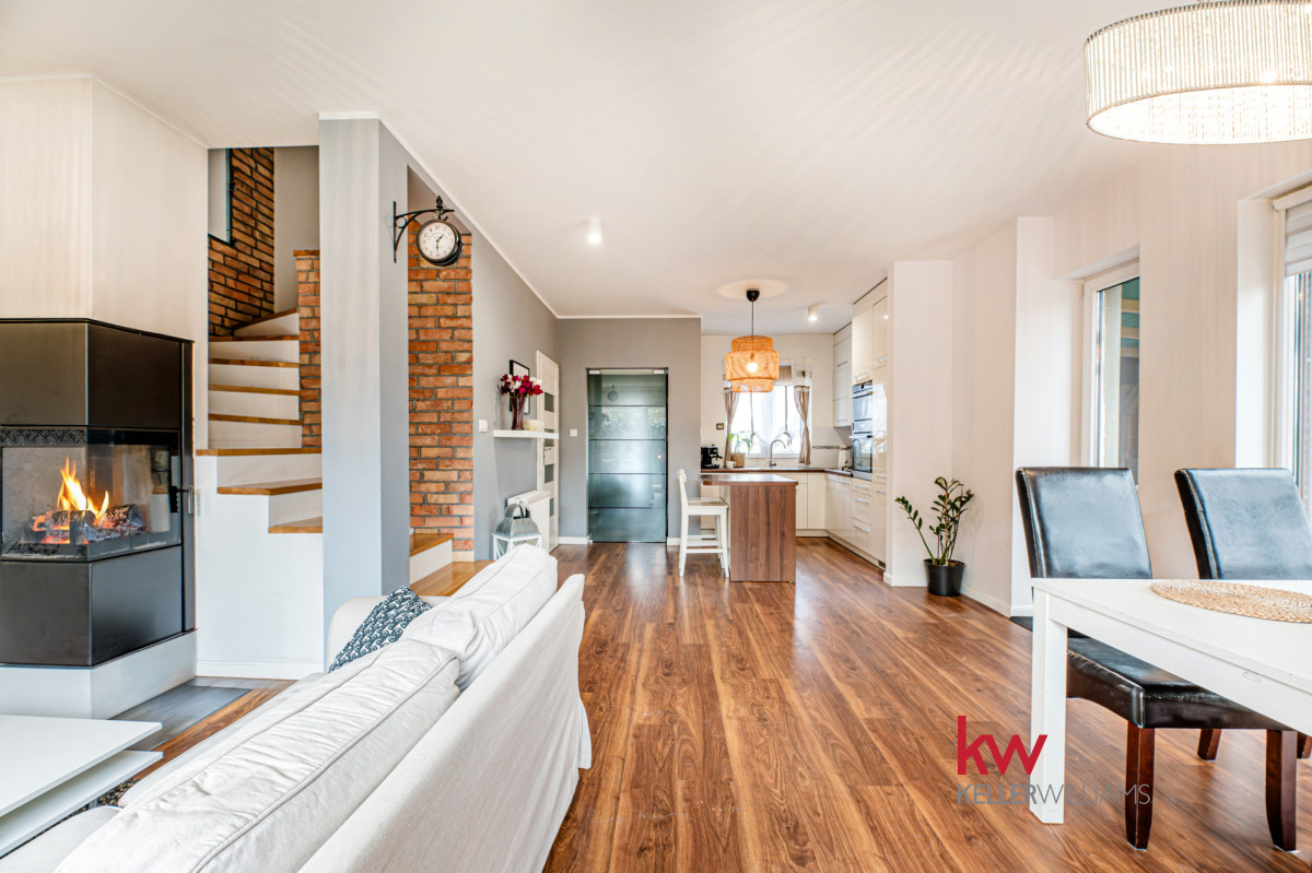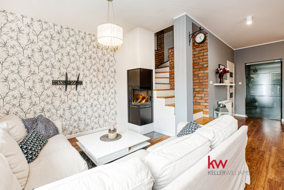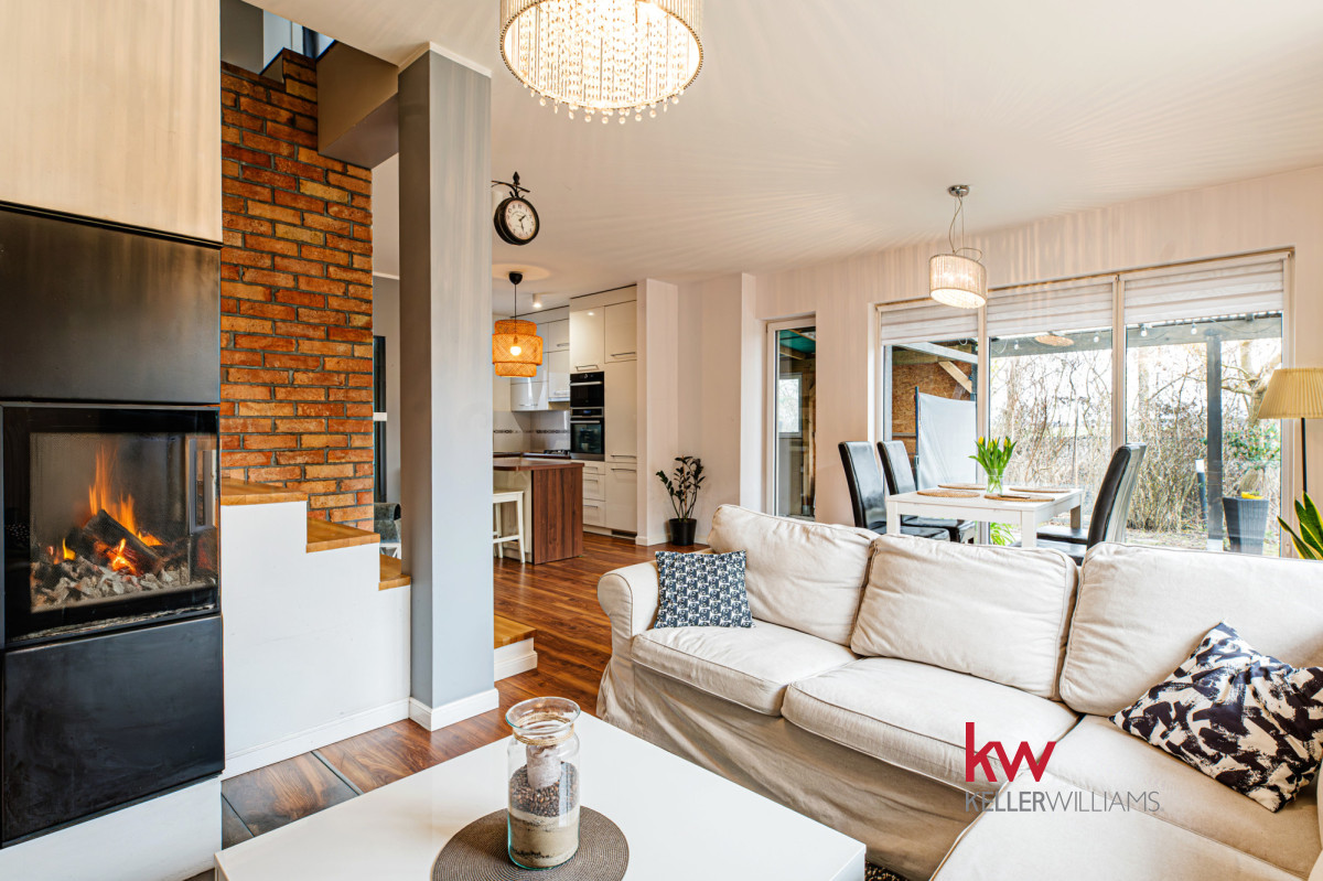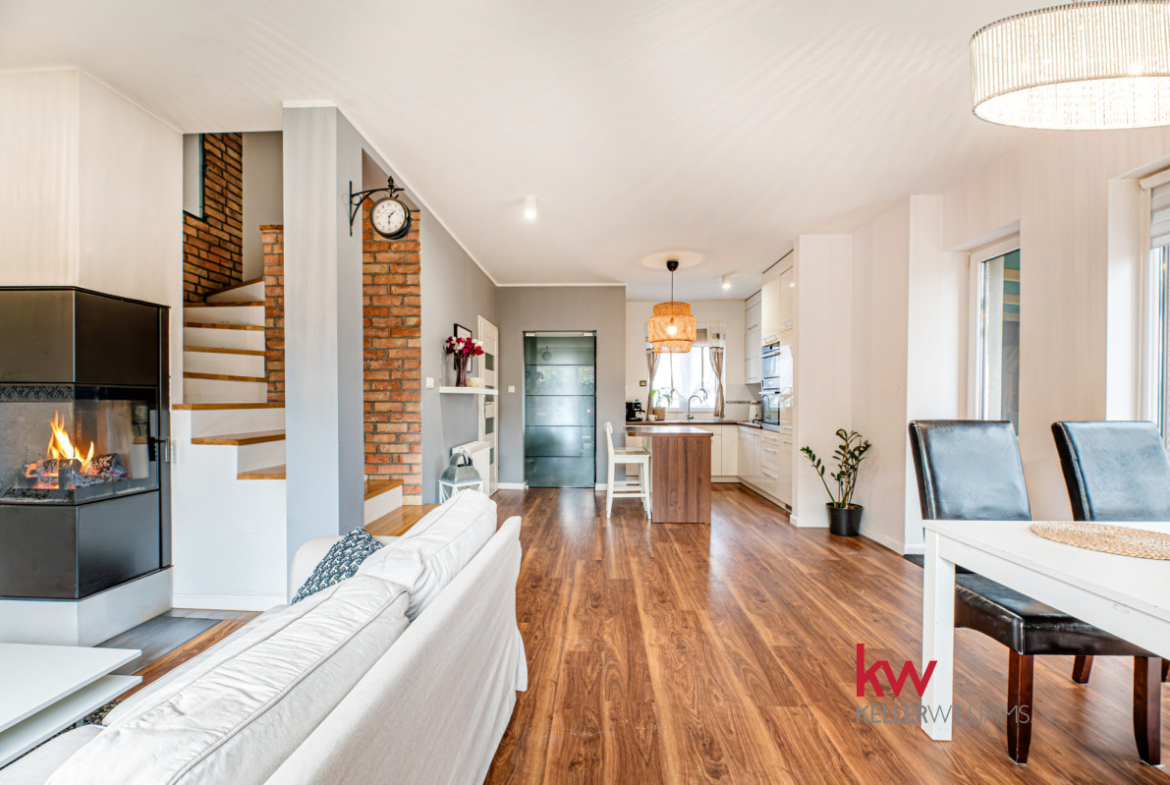 Salon: To prawdziwa perełka tego domu! Przestronna i pięknie zaprojektowana przestrzeń z kominkiem, to idealne miejsce na relaks w każdą porę roku. Wyobraź sobie poranki z kubkiem ulubionej kawy, otoczonej zielenią i śpiewem ptaków.