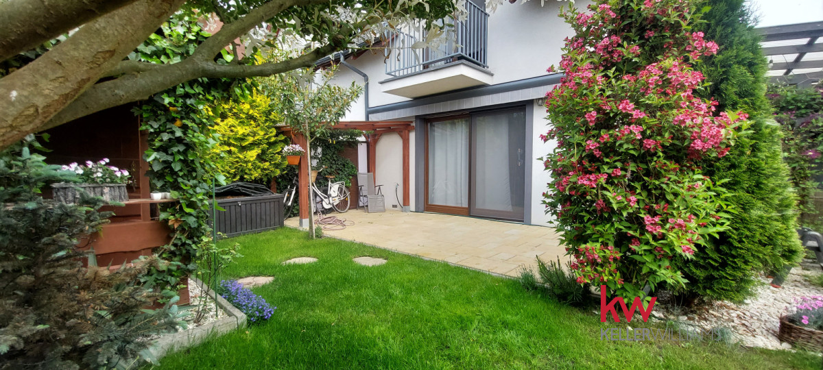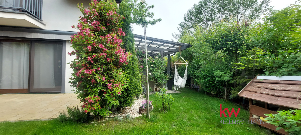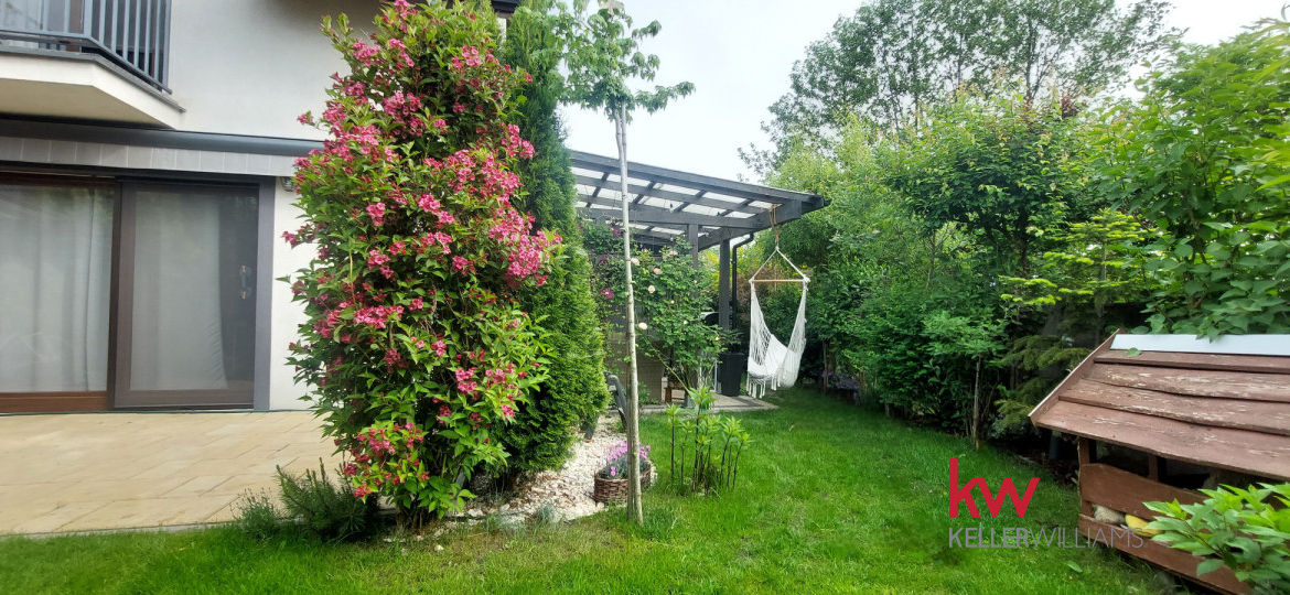 4. Zagospodarowanie terenu: opłotowanie ogrodu siatką parkanową z obrzeżem trawnikowym, front zagospodarowany, wejście i chodniki wykonane z kostki brukowej. Na ogrodzie domke narzędziowy, taras, miejsce na basen, oraz wiata garażowa.
