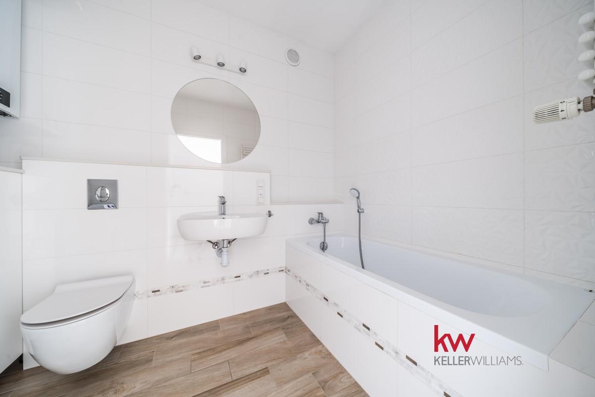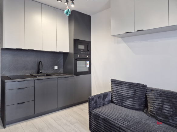 Mieszkanie posiada urządzoną i wyposażoną kuchnię (lodówka, płyta indukcyjna, piekarnik, okap, zmywarka) oraz łazienkę z wanną i pralką. W korytarzu szafa typu Komandor.