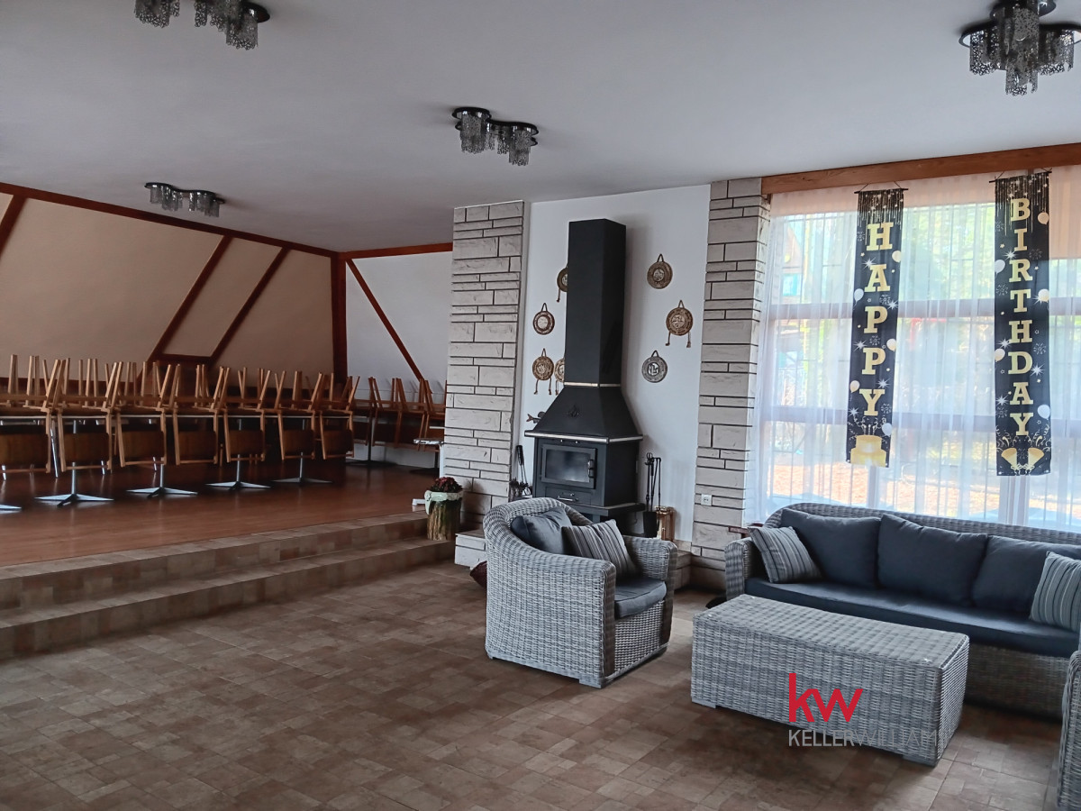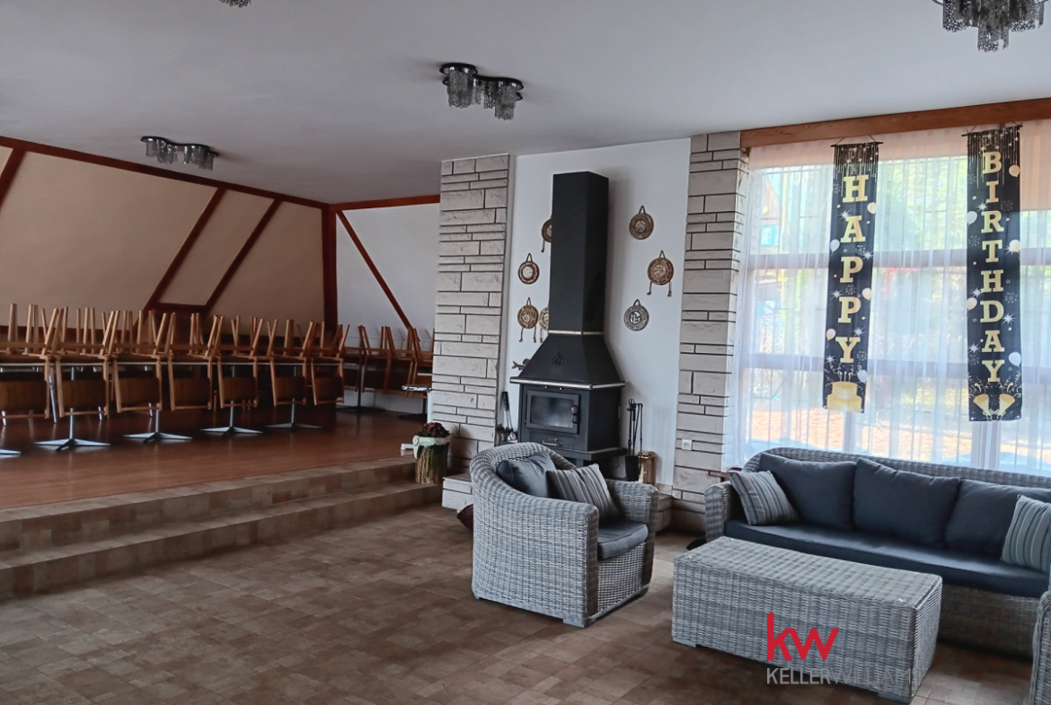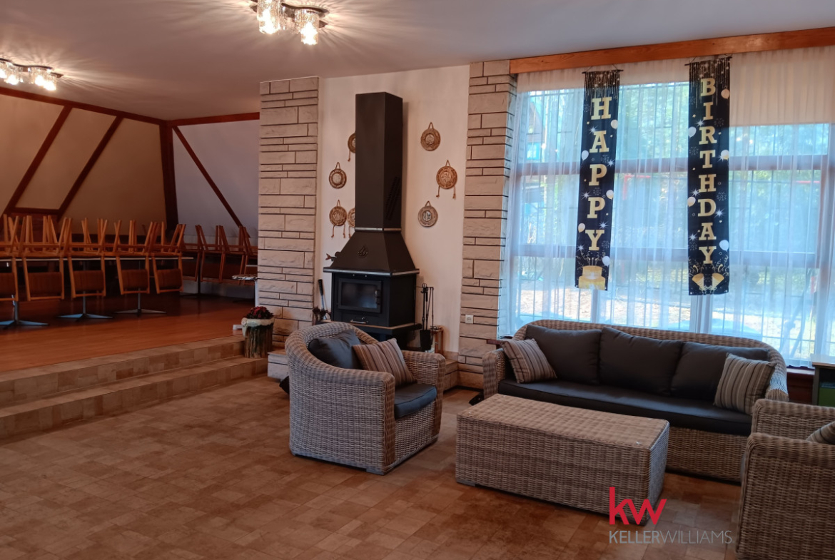 Oferuję Państwu obiekt w 1 linii brzegowej nad Zalewem Przeczyckim. Idealnie nadaje się na wszelkie szkolenia , kursy, spotkania integracyjne……. Budynek dwupoziomowy z dużym tarasem ( parter: sala szkoleń z kominkiem, na podwyższeniu miejsce np. na serwowanie posiłków, z zapleczem kuchennym, 2 toalety) w fantastycznej lokalizacji. Piętro : sala bilardowa z miejscami do wypoczynku.