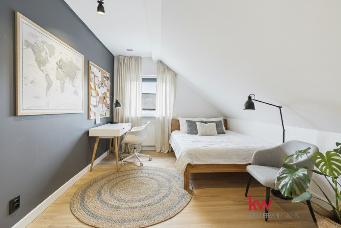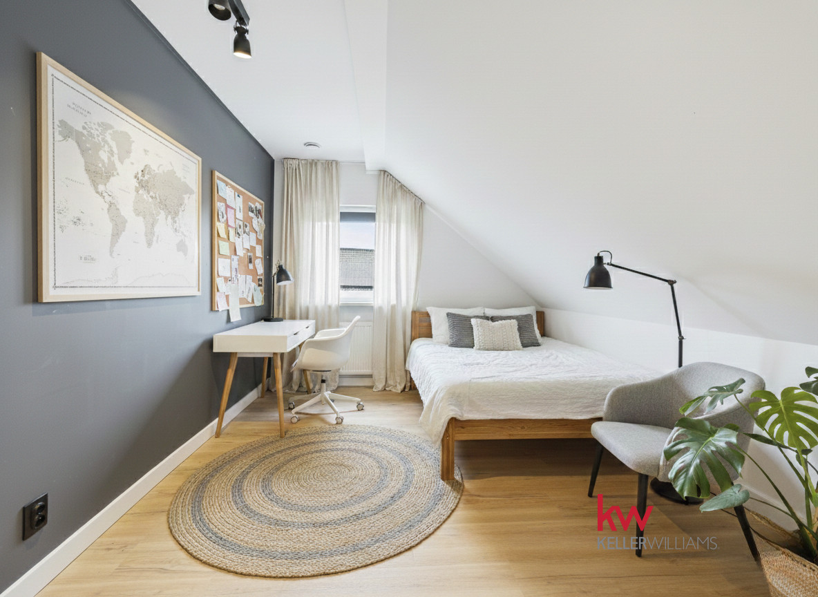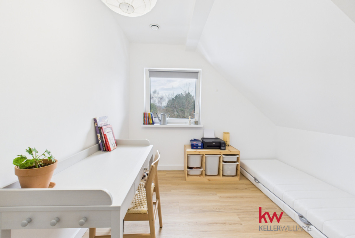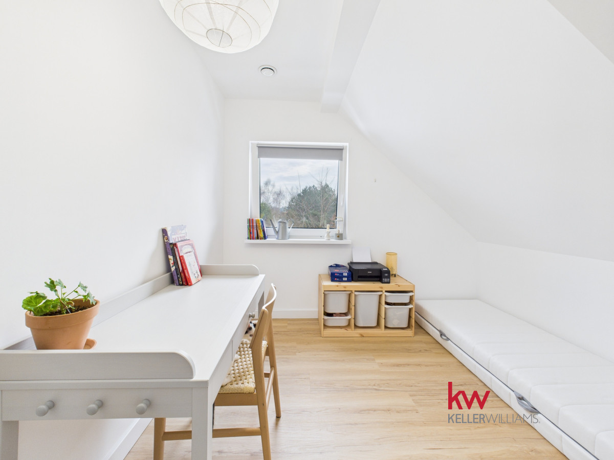 Na parterze znajdują się dwa duże pokoje, w tym jeden z garderobą. Na piętrze są cztery pokoje, łazienka oraz duży hol. Taki rozkład daje realną wygodę życia – dzieci mogą mieć własną przestrzeń, rodzice swój spokój, a praca zdalna nie musi odbywać się przy stole w salonie.