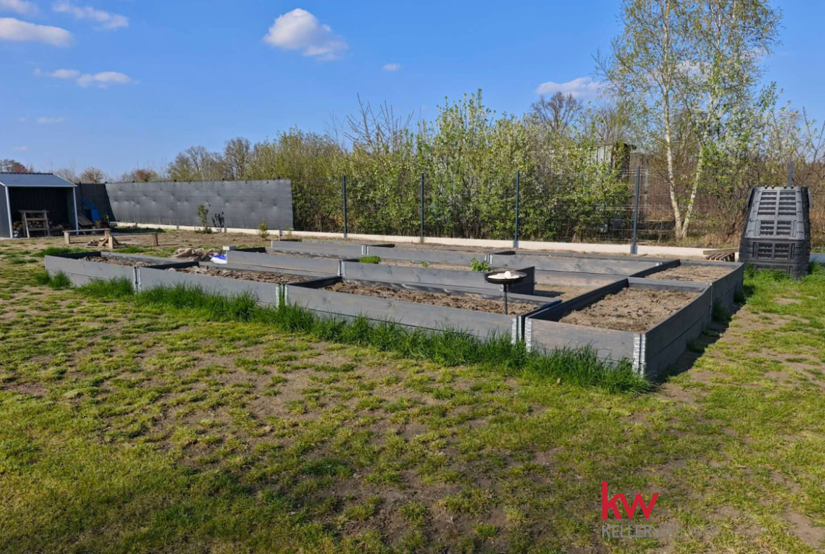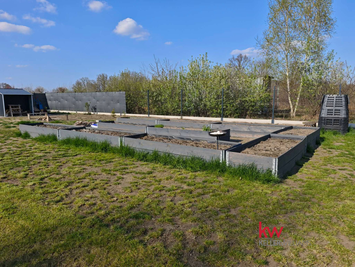 - ogrodzona, zadbana działka z nasadzeniami i miejscem na warzywnik