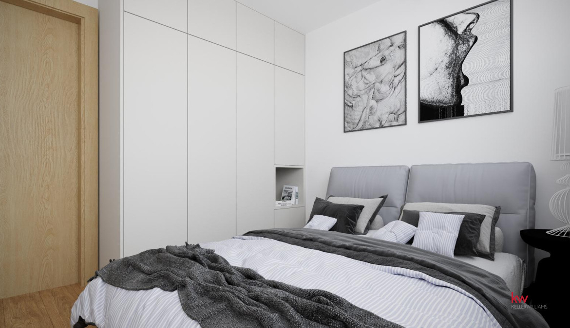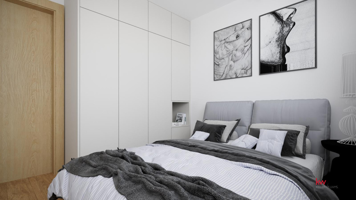 Przestrzeń do przechowywania: W mieszkaniu zaplanowano idealne miejsce pod pojemną szafę w zabudowie, która zajmie całą długość ściany i z powodzeniem pomieści garderobę domowników.