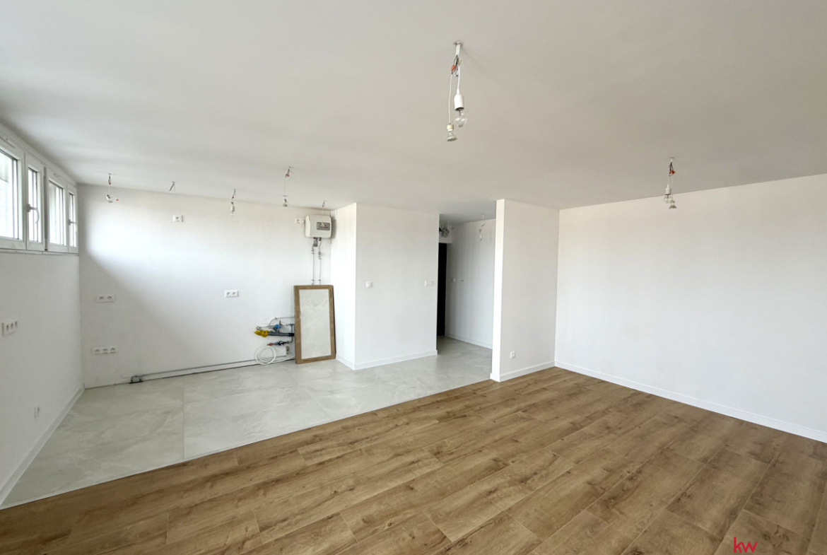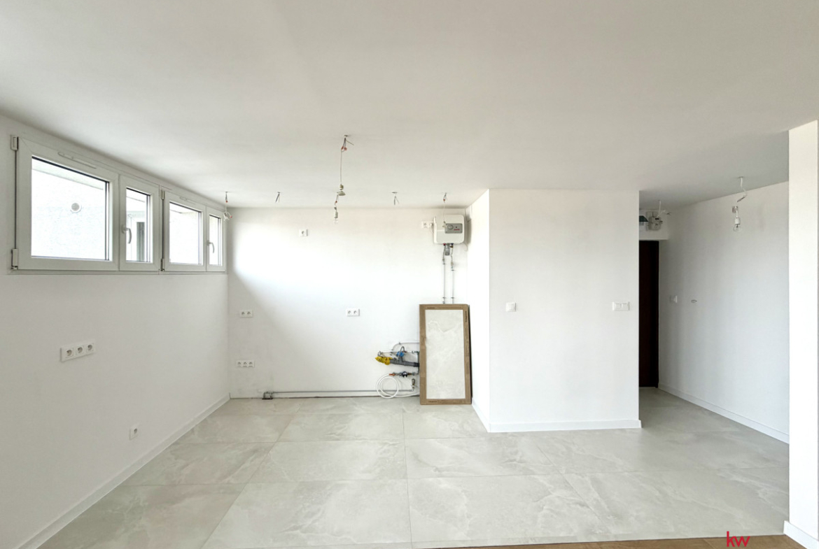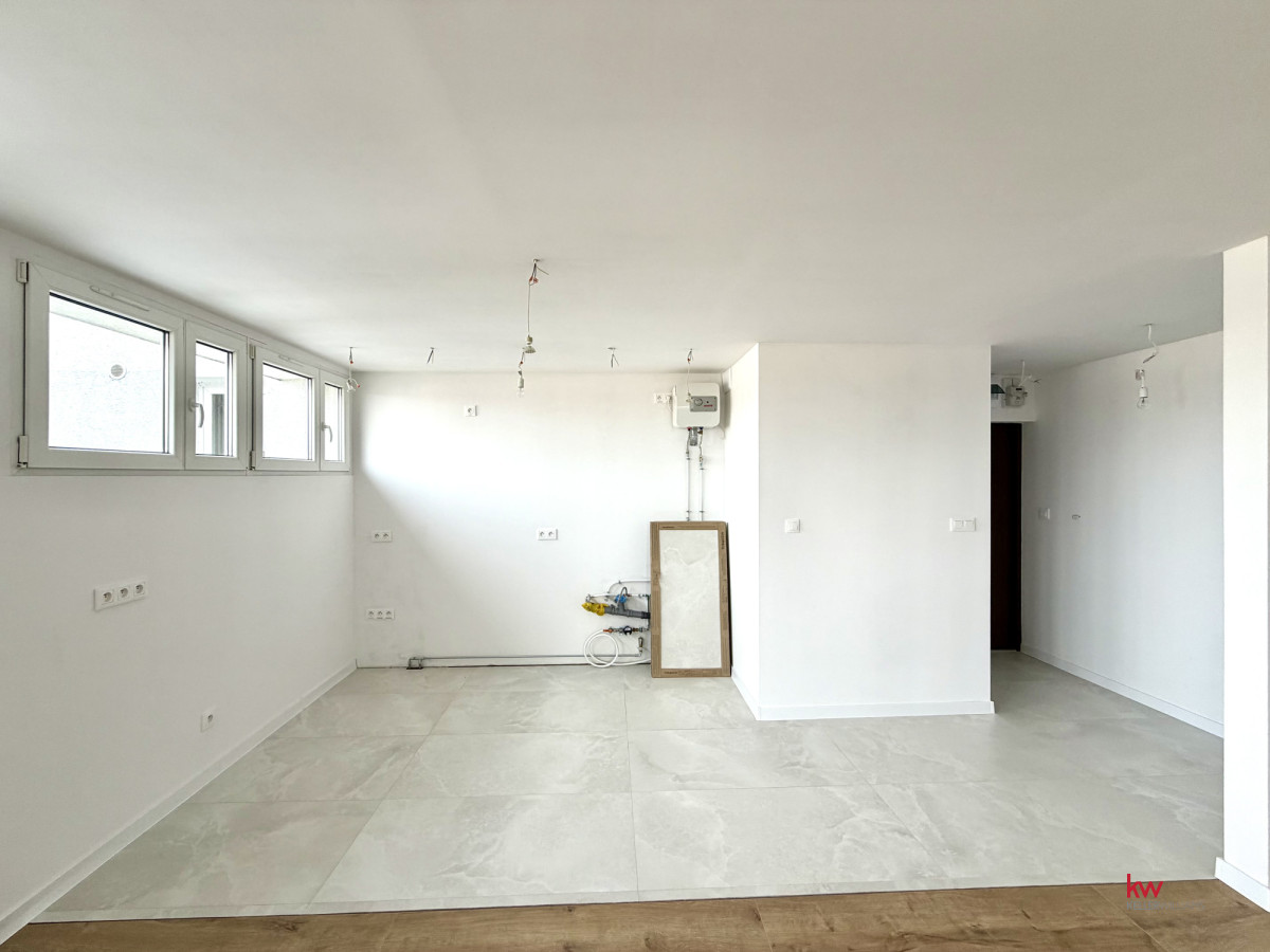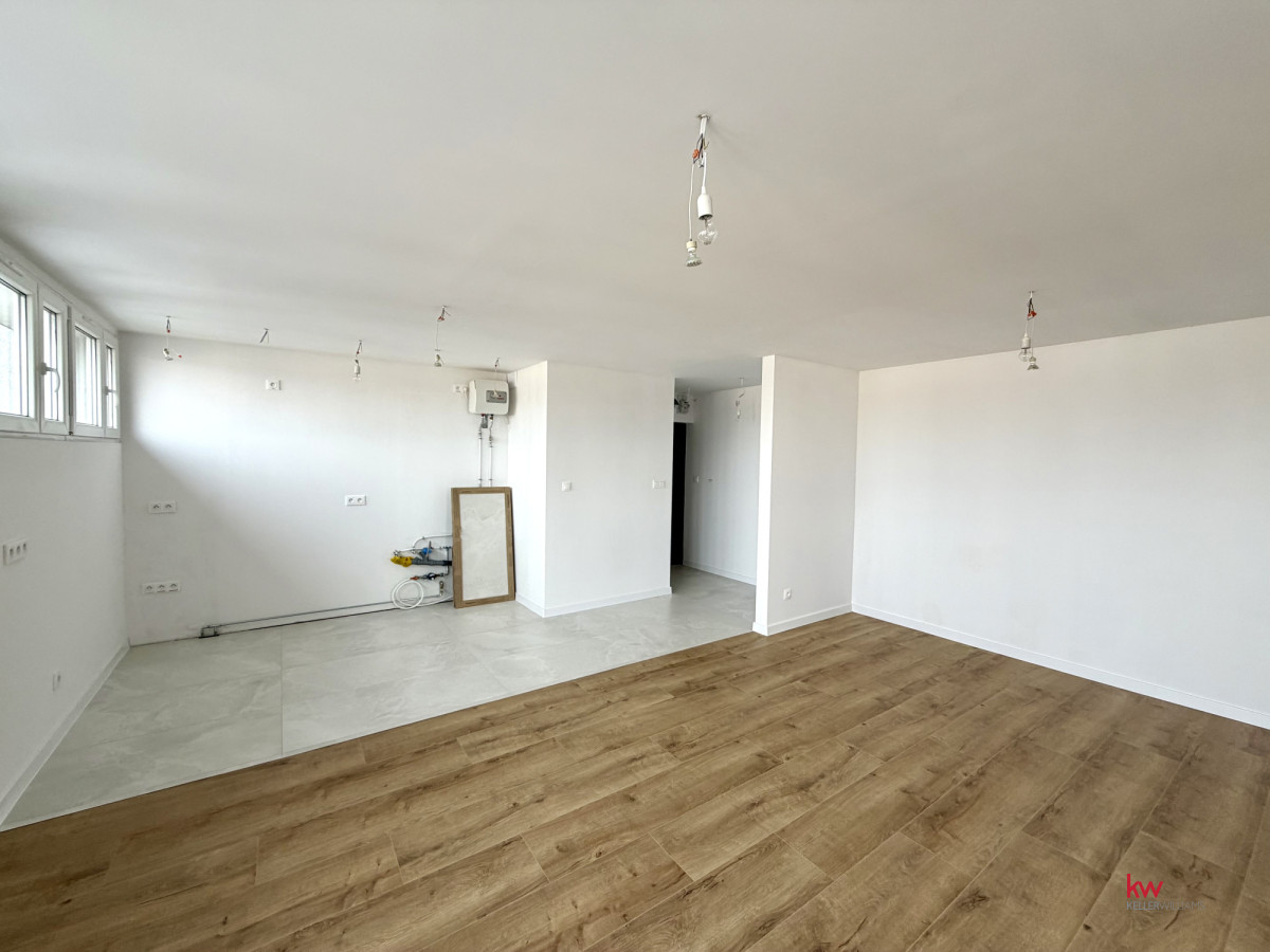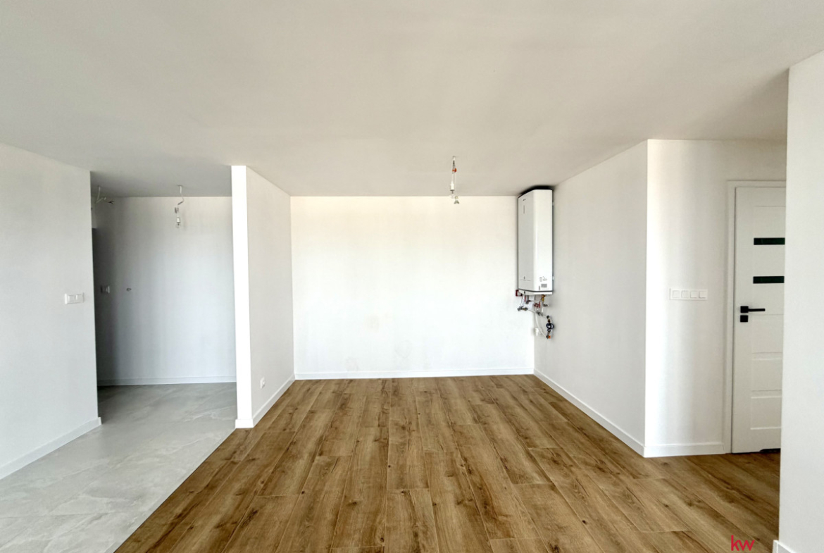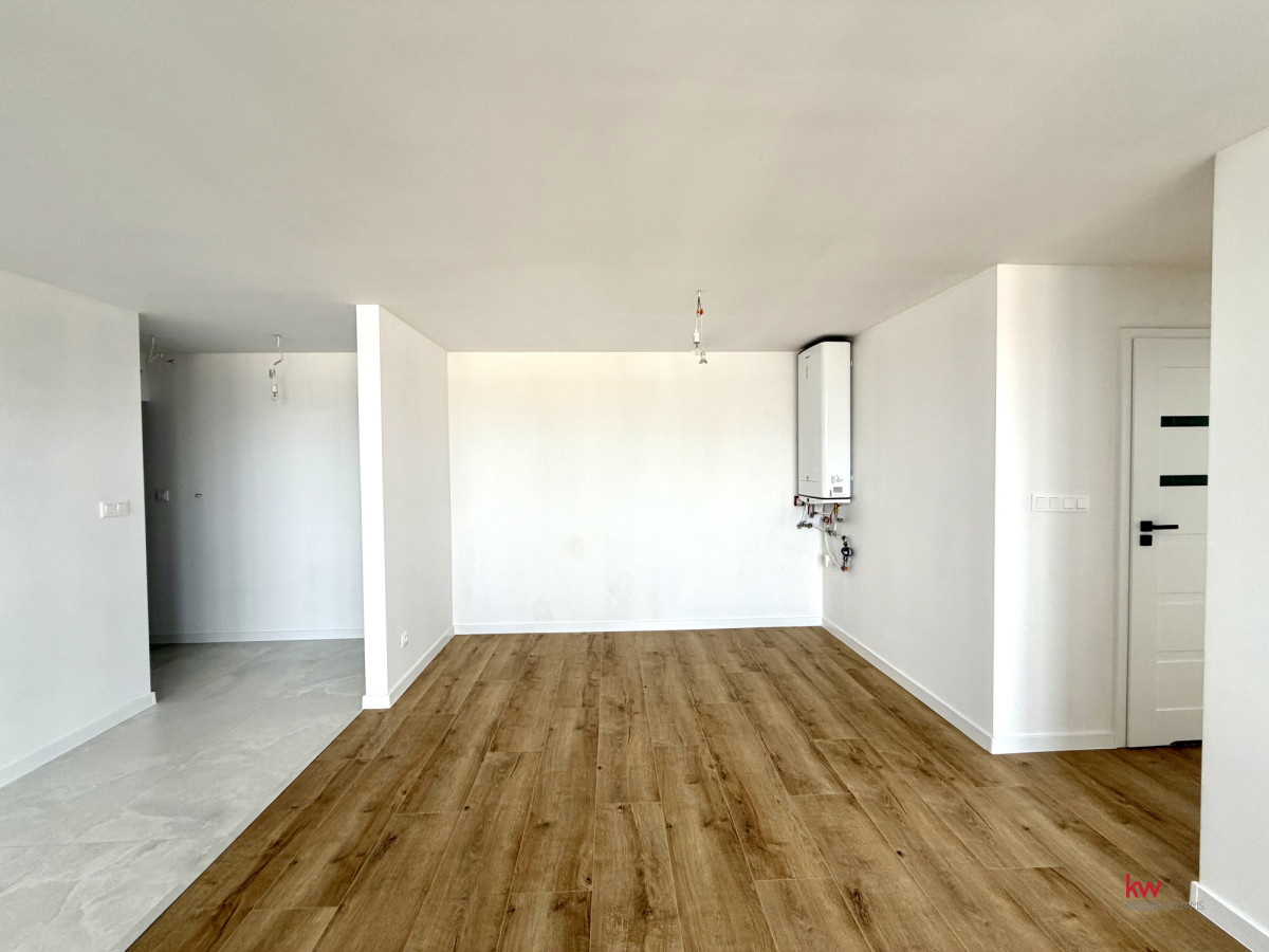 Salon z aneksem kuchennym: Niezwykle przestronny i jasny salon, płynnie łączący się z aneksem. Przestrzeń kuchenna została odpowiednio przygotowana pod kątem instalacji, dając możliwość montażu dużej, nowoczesnej wyspy kuchennej.