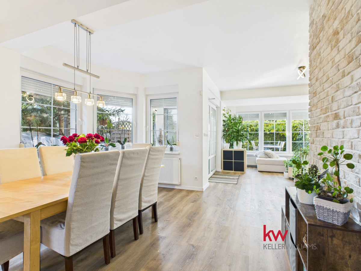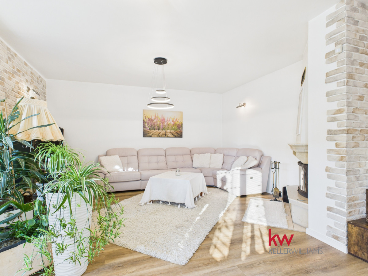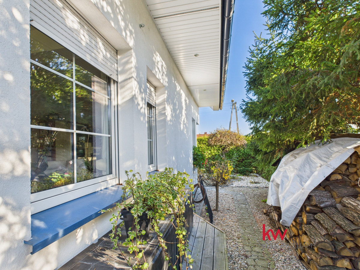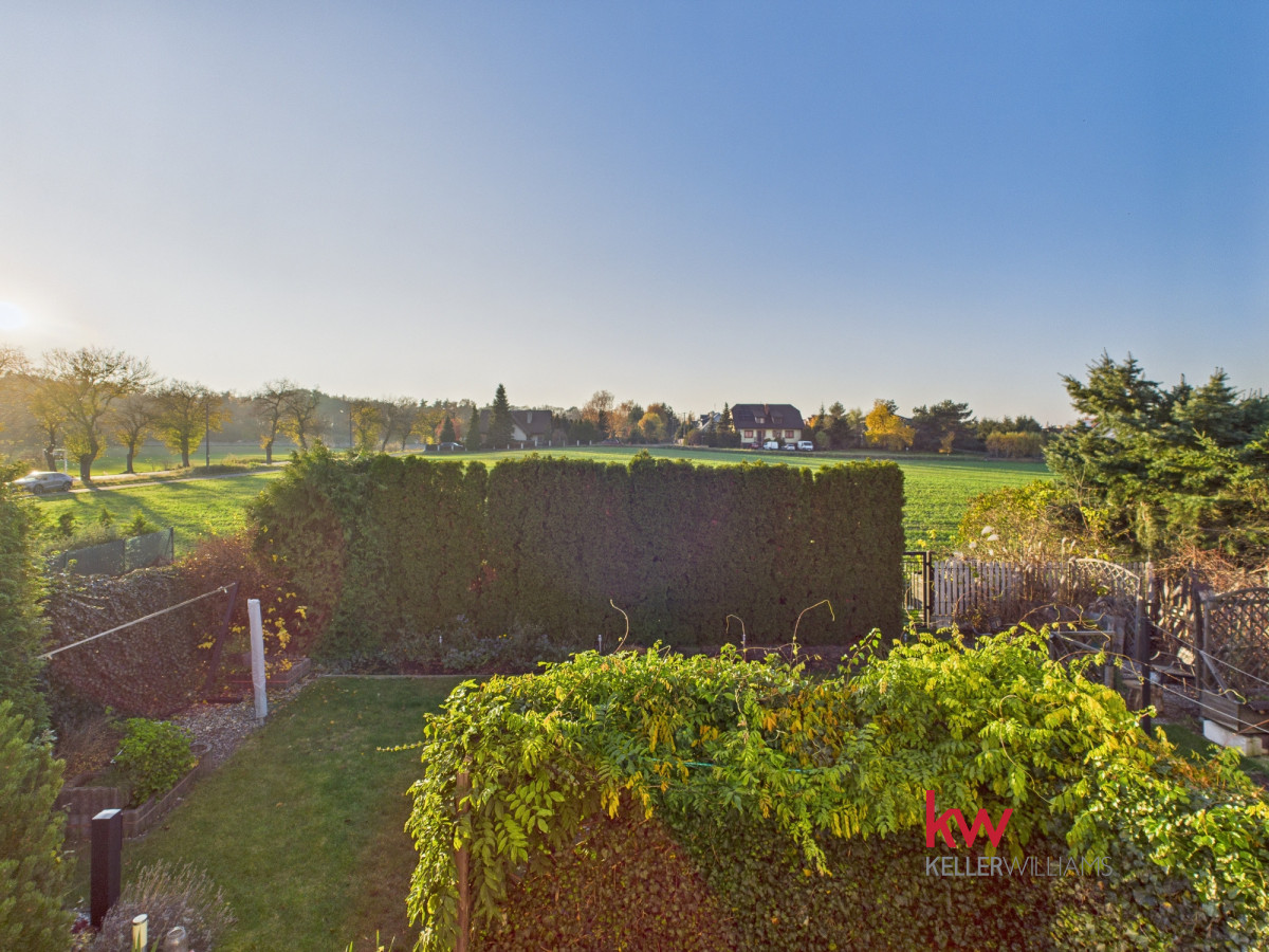 Część dzienna jest doskonale doświetlona dzięki dużym oknom od strony południowej i zachodniej. Salon oferuje widok na zadbany ogród, za którym rozciąga się pole sąsiada – brak zabudowy gwarantuje ciszę, prywatność i piękne widoki przez cały rok.