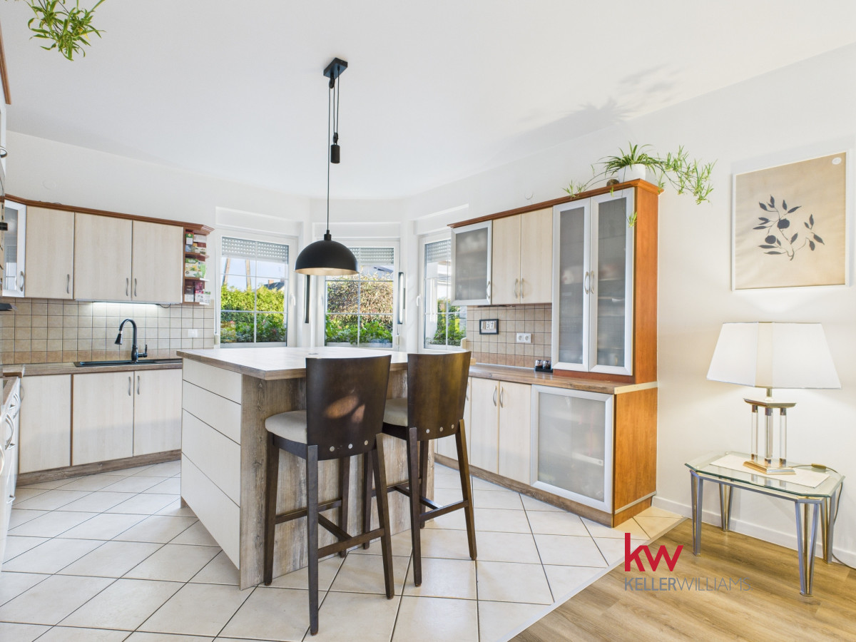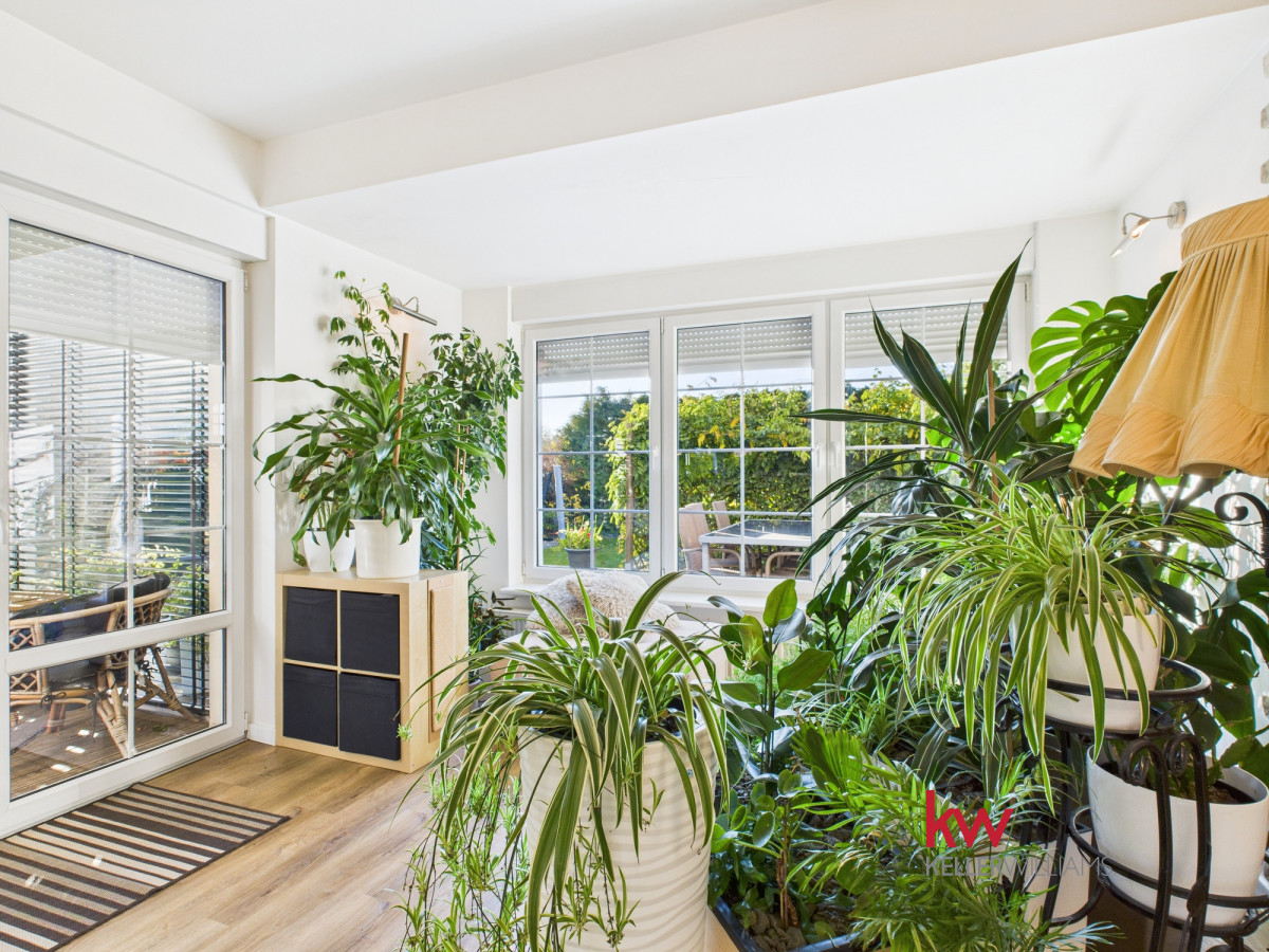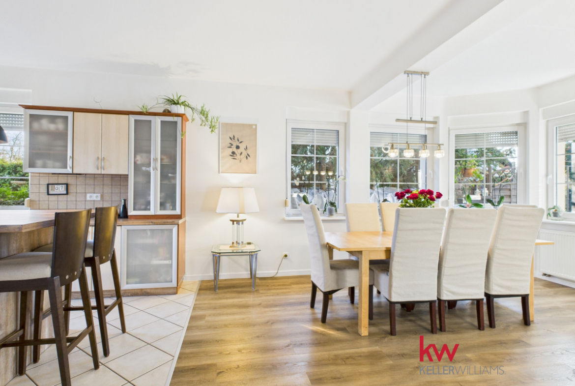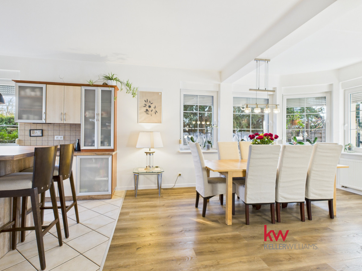Część dzienna jest doskonale doświetlona dzięki dużym oknom od strony południowej i zachodniej. Salon oferuje widok na zadbany ogród, za którym rozciąga się pole sąsiada – brak zabudowy gwarantuje ciszę, prywatność i piękne widoki przez cały rok.
