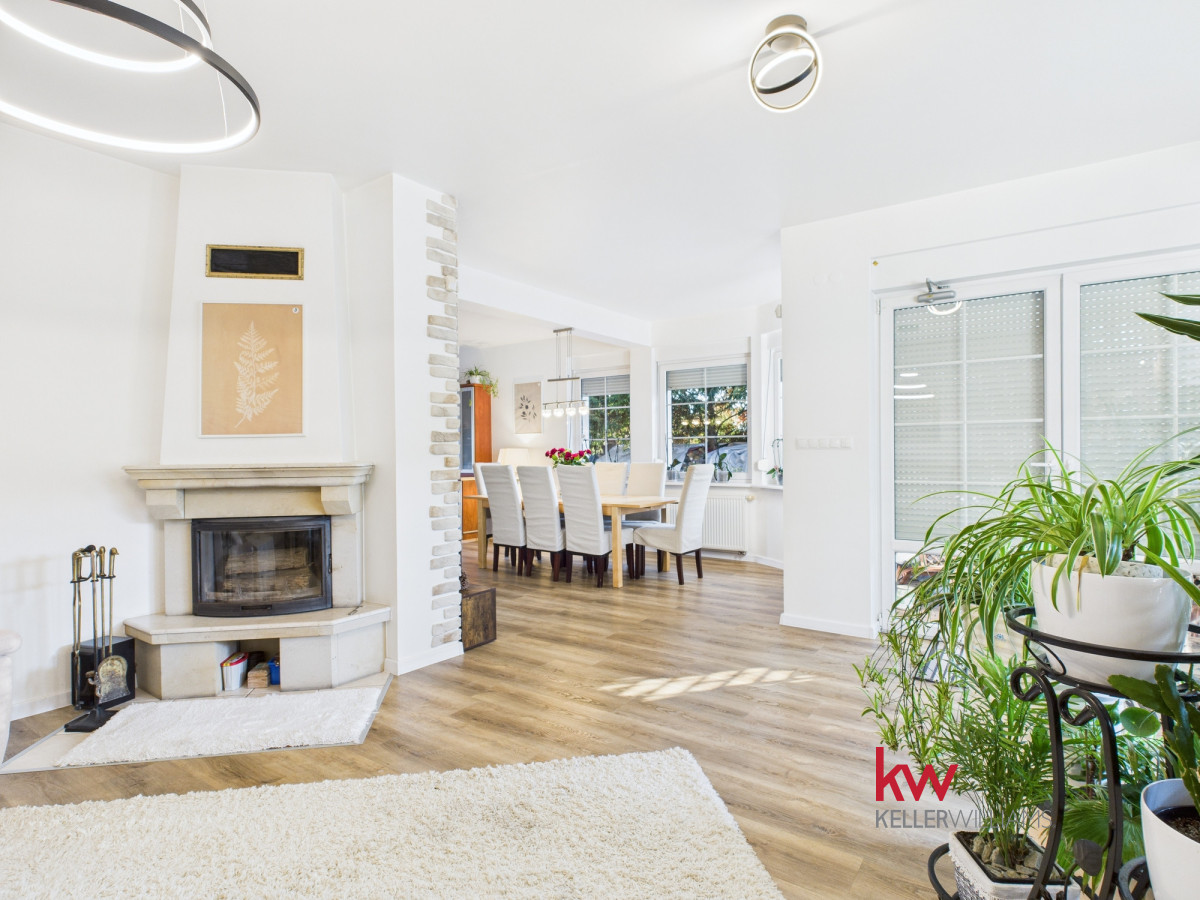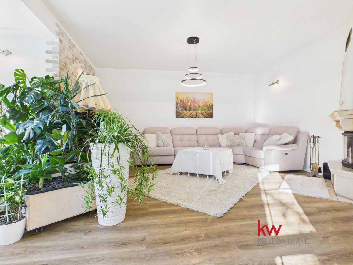 • imponujący, jasny open space – salon z kominkiem oraz ogromna, perfekcyjnie zaprojektowana kuchnia