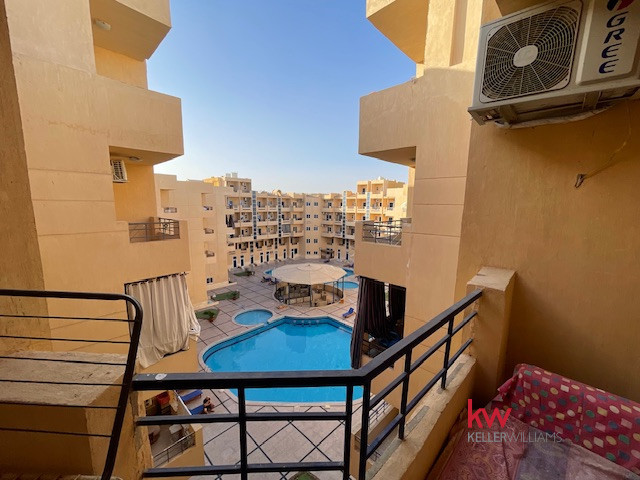 Balkon wychodzi na basen i spokojne wnętrze kompleksu.