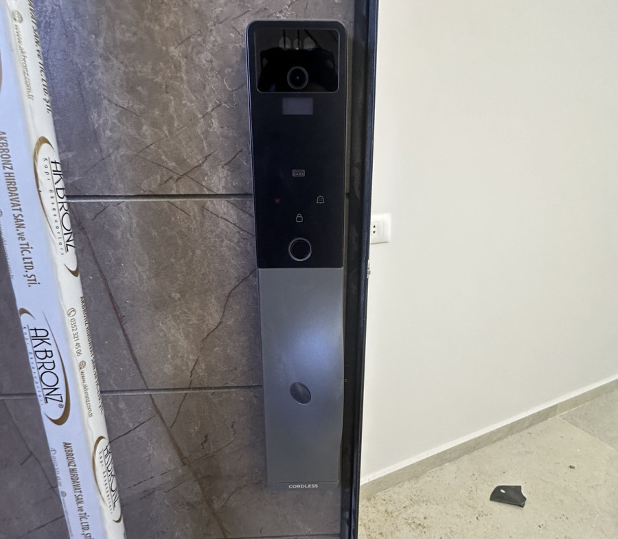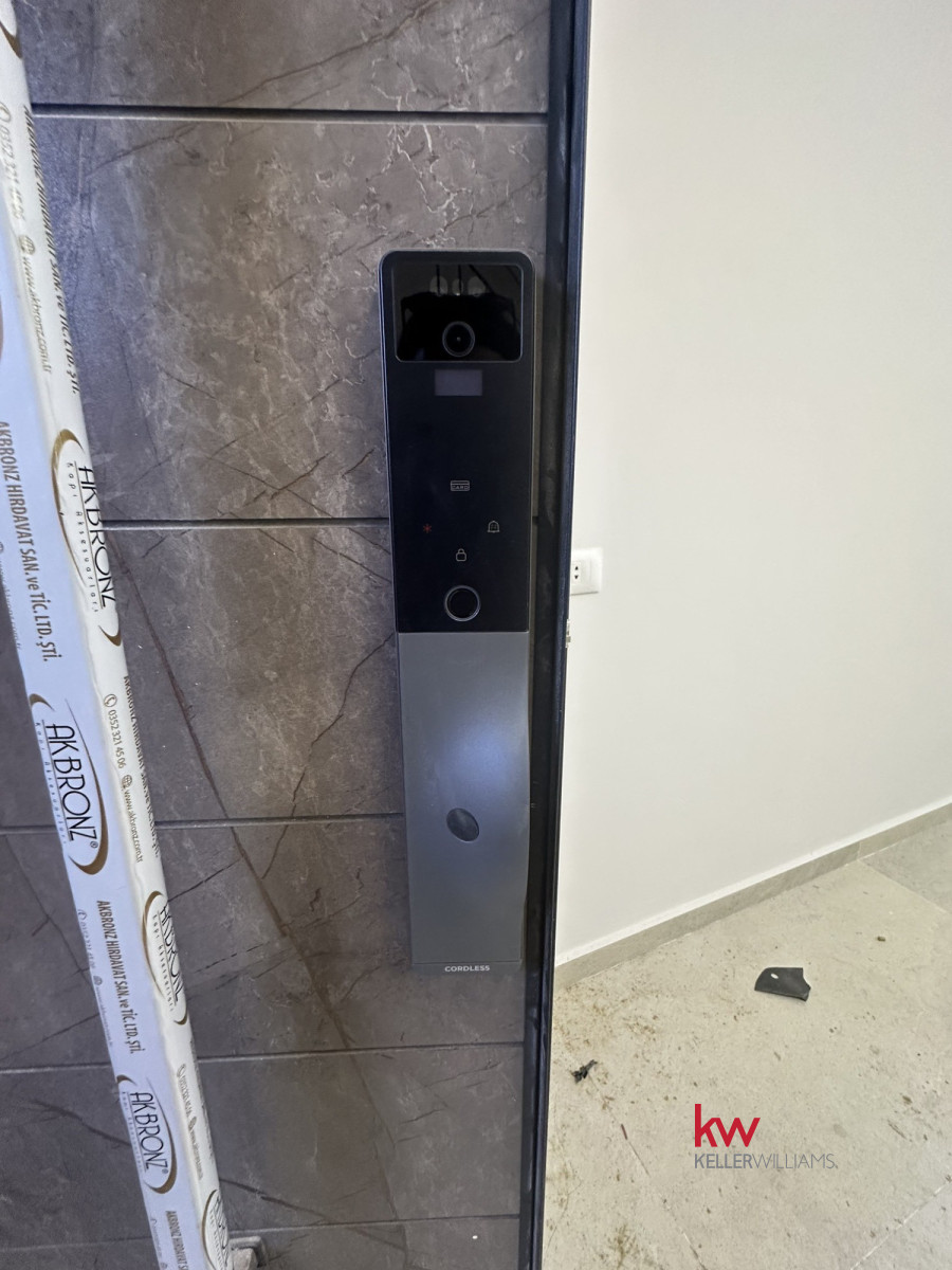 Drzwi wejściowe wyposażone są w inteligentny zamek z kodem i monitoringiem wideo.