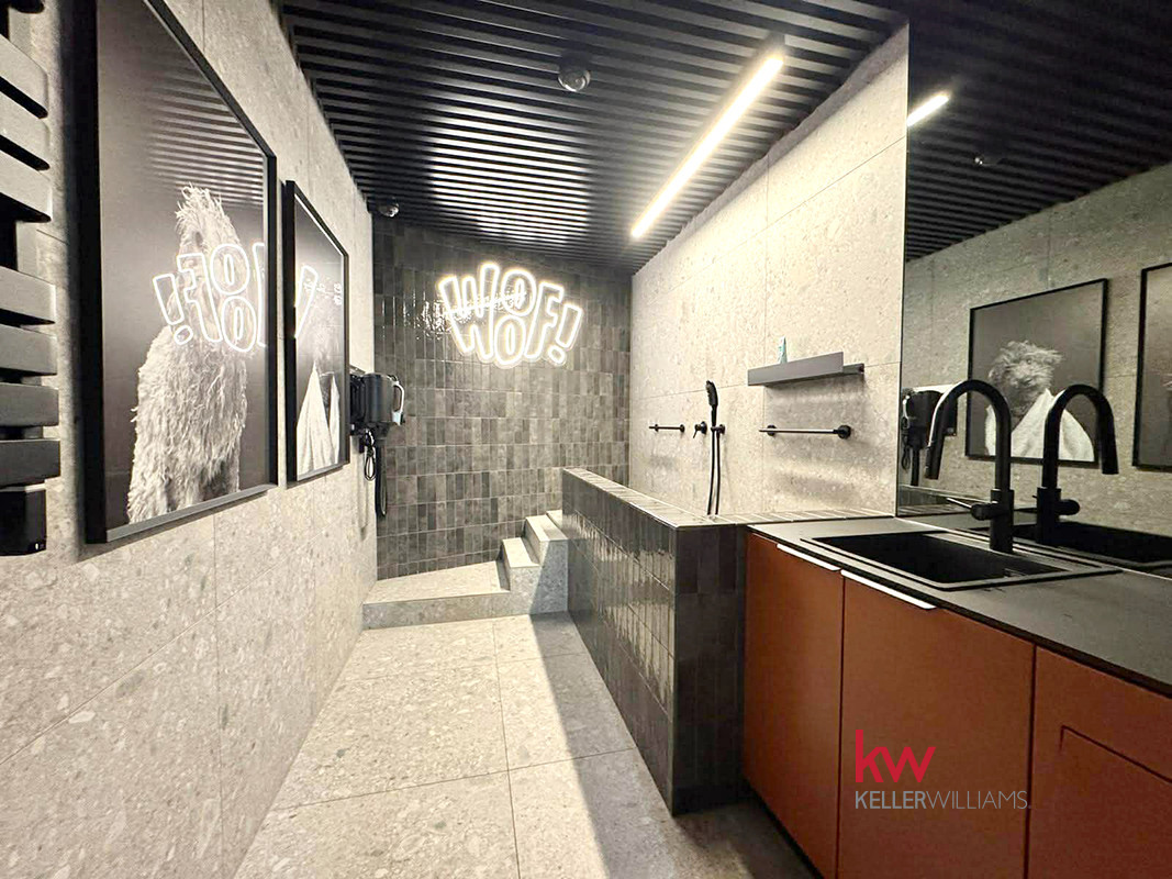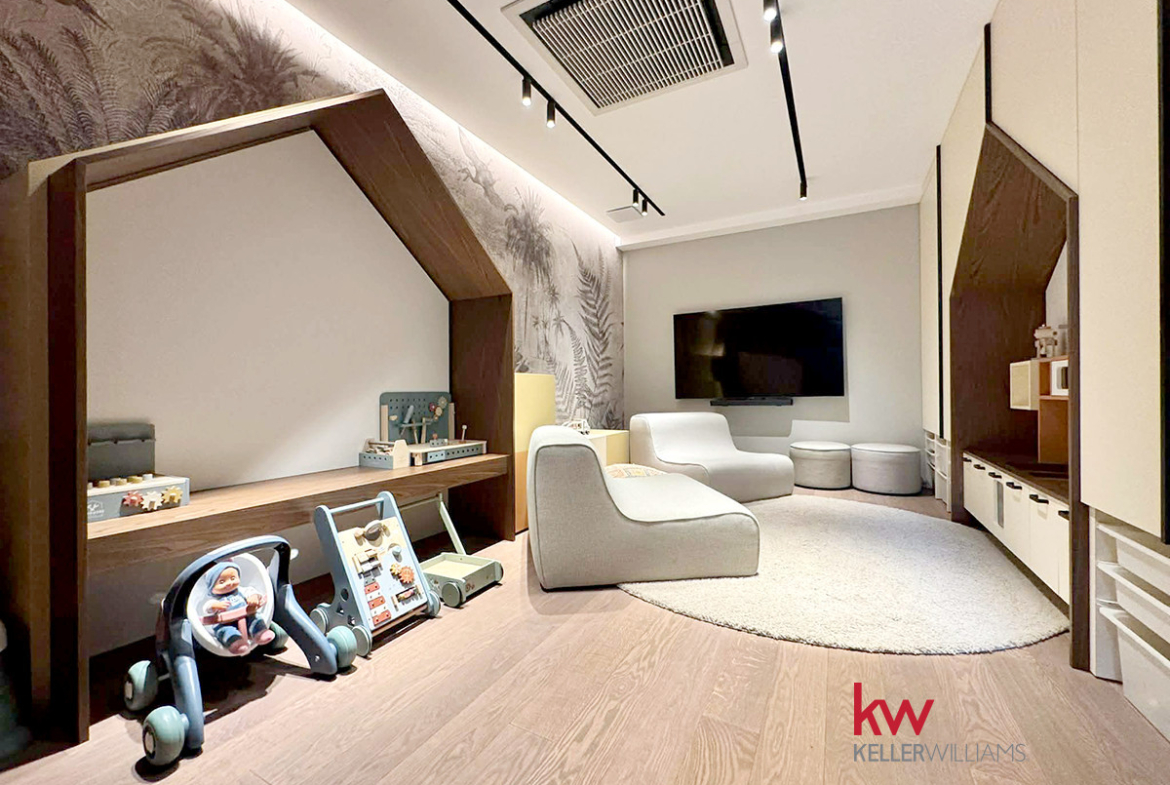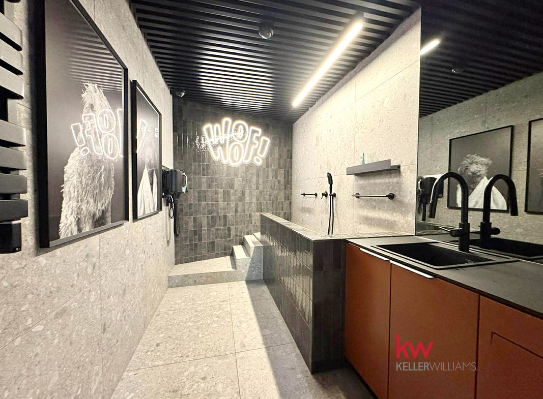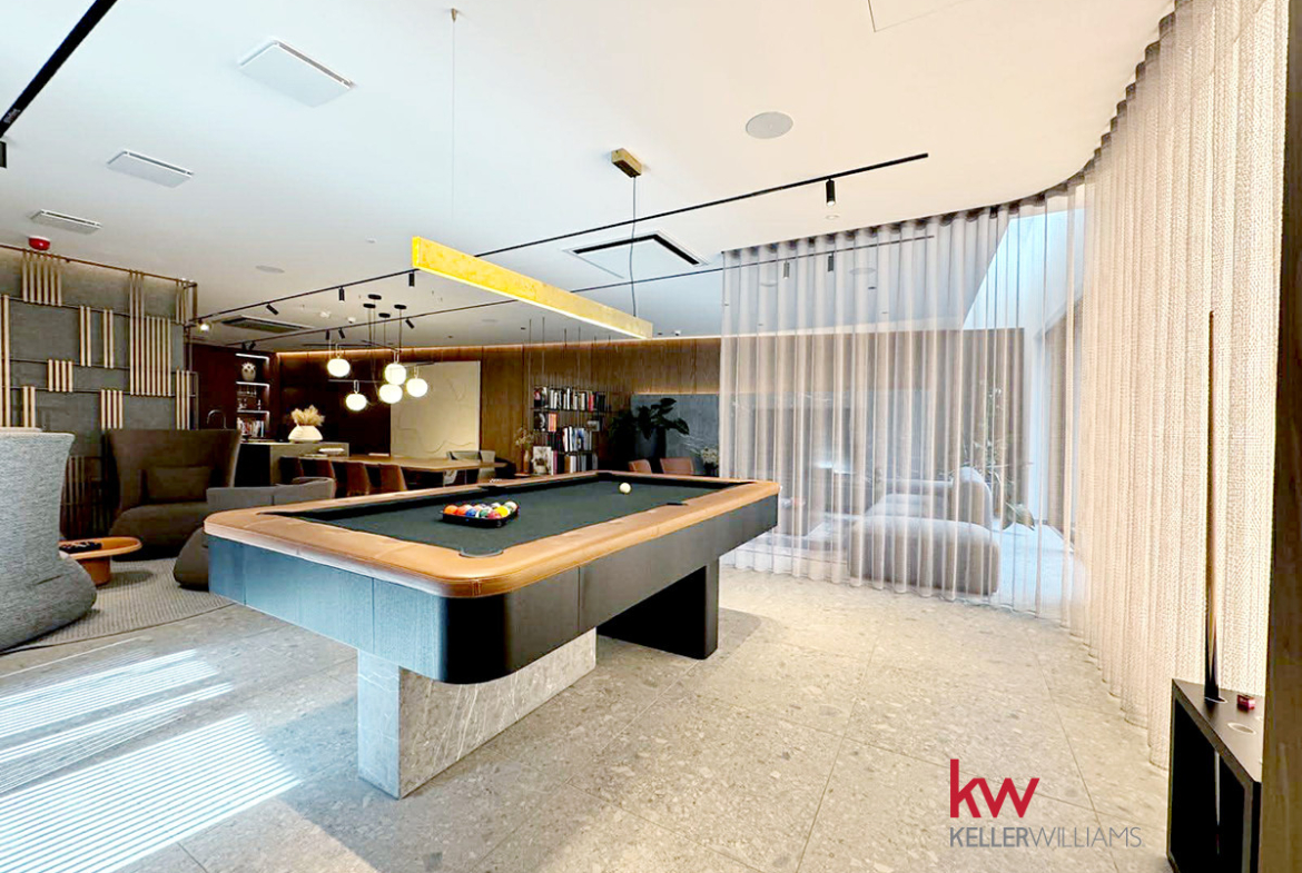 A sauna, massage studio, fitness/yoga room, cinema room, gaming room, DIY workshop, children’s playroom, gym with a boxing bag, car wash, bicycle workshop, coworking space with a library, club room with billiards, “dog wash” station, and a refrigerated locker for package deliveries.