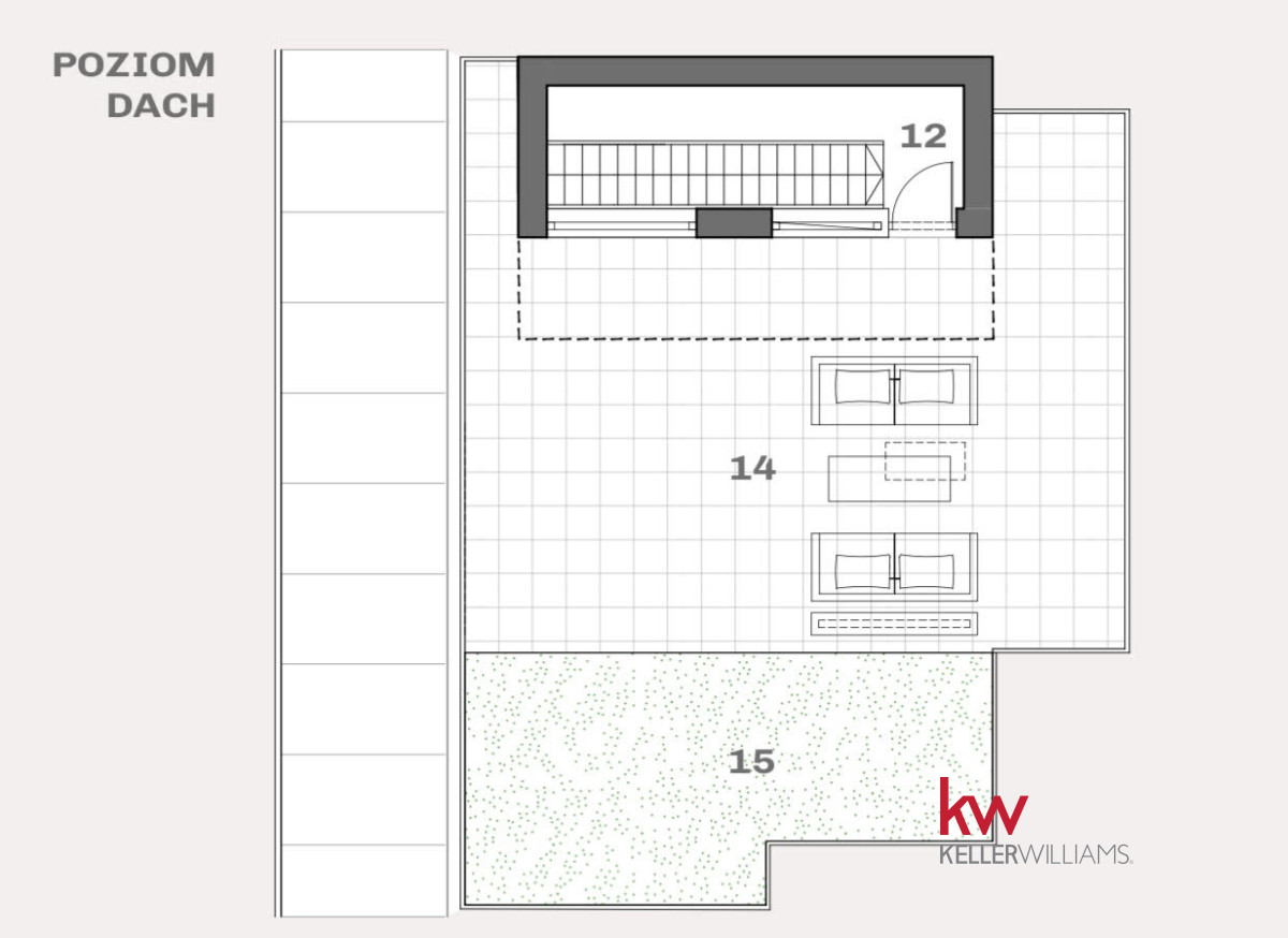– Poziom 3: Przedpokój prowadzący na dach, gdzie znajduje się potężny taras (53,88 m²) oraz ogród.