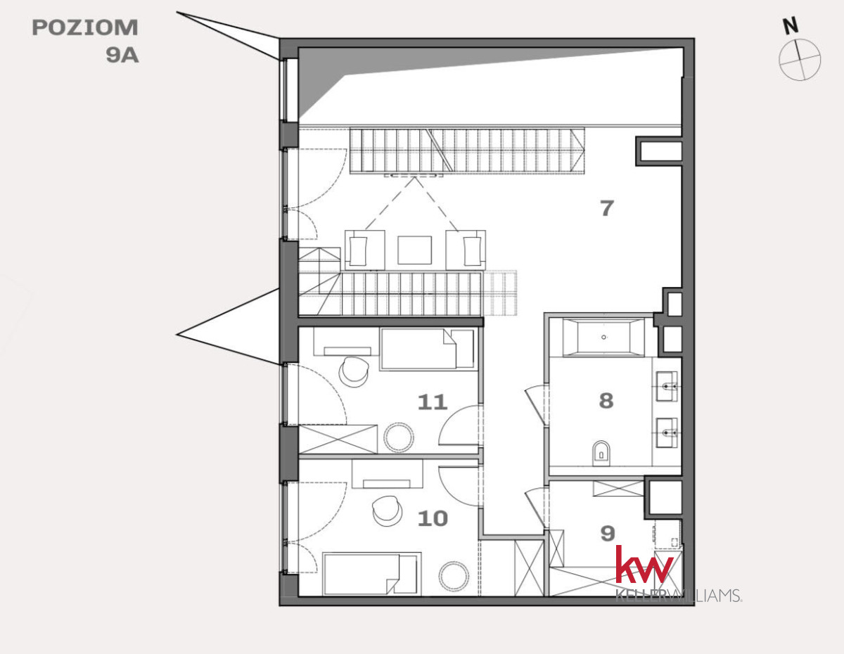 Mieszkanie znajduje się na najwyższych piętrach (9 i 10) i składa się z: