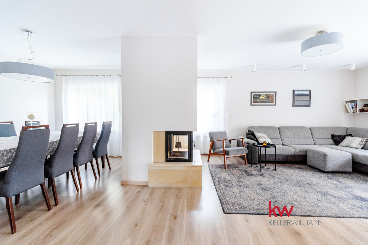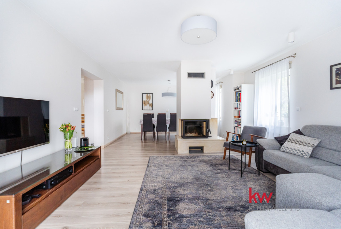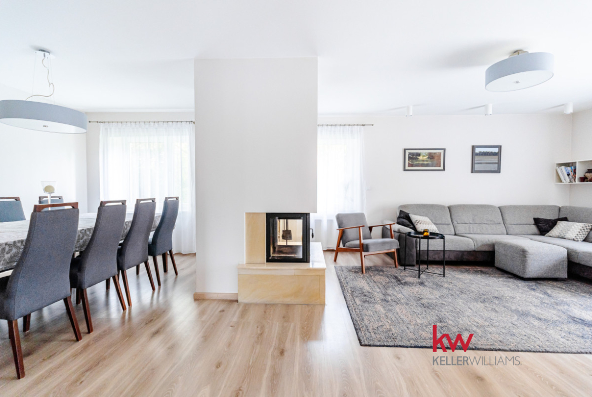 W sercu salonu znajduje się przytulny kominek – wyobraź sobie rodzinną Wigilię przy jego blasku, z miejscem dla dwudziestu gości i zapachem świątecznych potraw unoszącym się w powietrzu. To miejsce zapisze w Tobie niezapomniane wspomnienia pełne ciepła i bliskości.