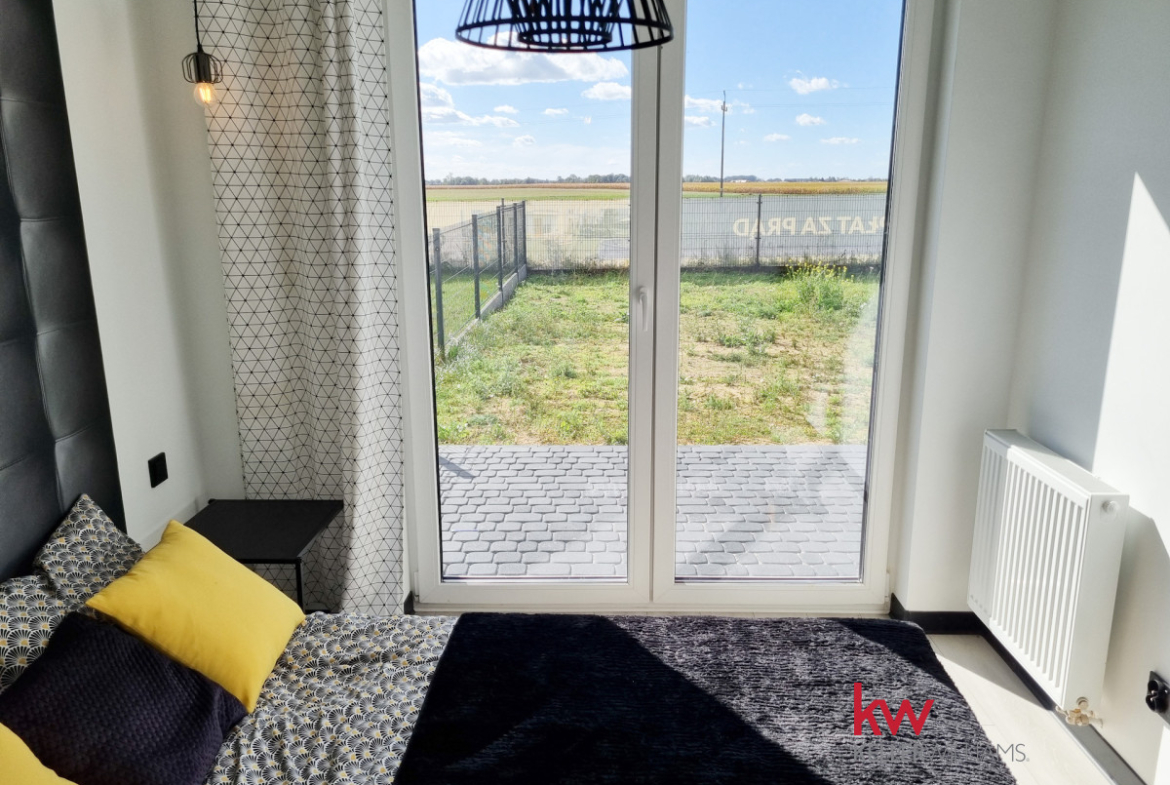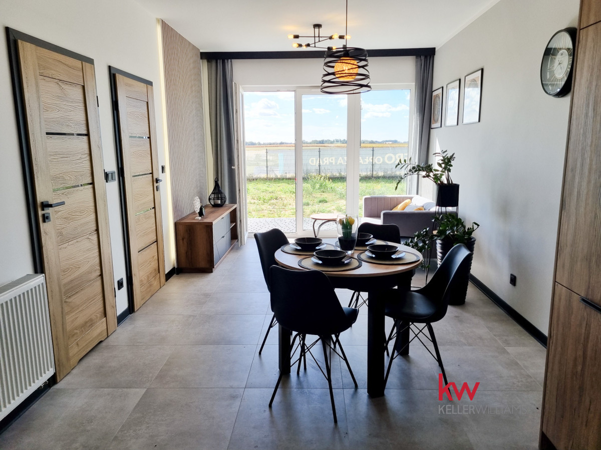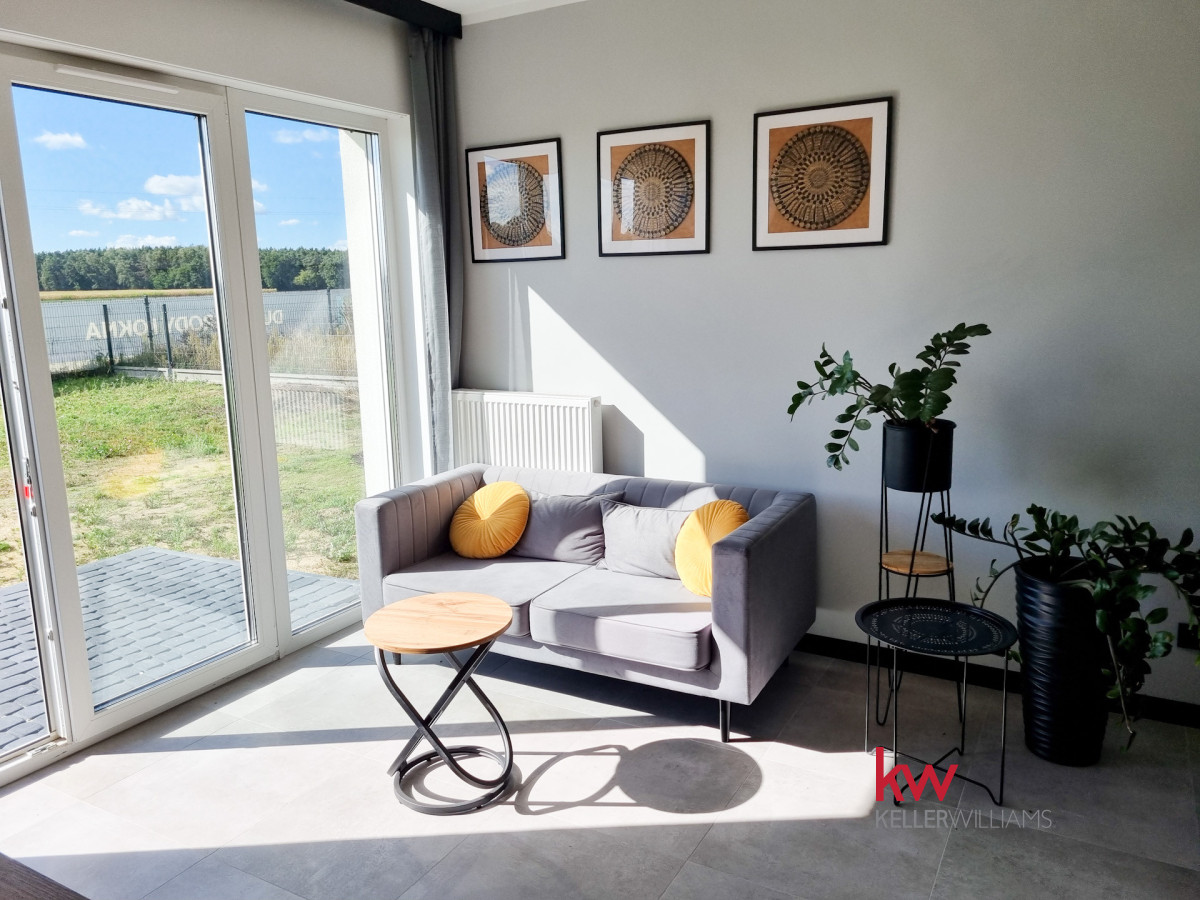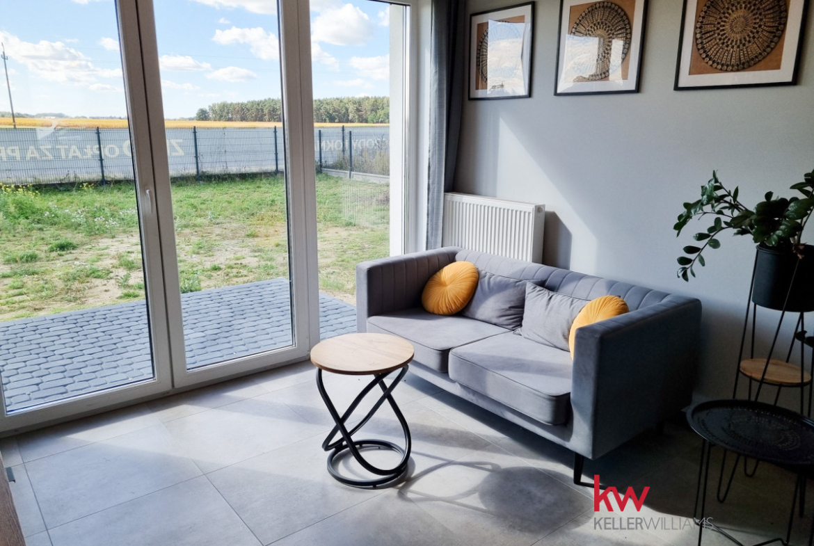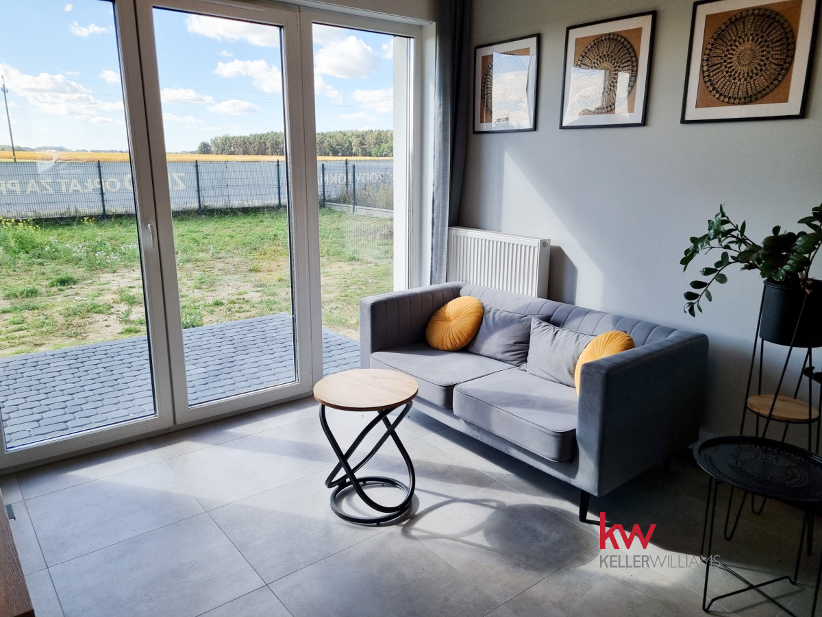 Z pokoju dziennego oraz ze sypialni jest wyjście na taras i duży ogród ok. 170 m2.