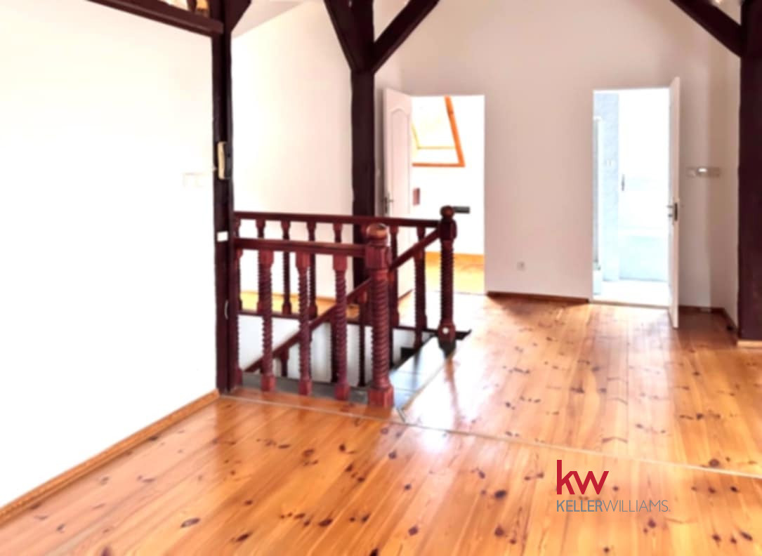 Styl wykończenia to klasyczny loft/industrial – drewniane podłogi, widoczna konstrukcja dachu i dużo naturalnego światła.
