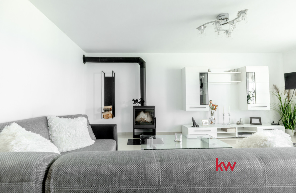 Poziom -1 (relaks i dodatkowa przestrzeń): drugi salon z klimatyczną kozą/kominkiem i bezpośrednim wyjściem do ogrodu, praktyczna spiżarnia oraz dodatkowy pokój – świetny na gabinet, strefę hobby lub pokój gościnny. Tu również trwałe, białe kafle.