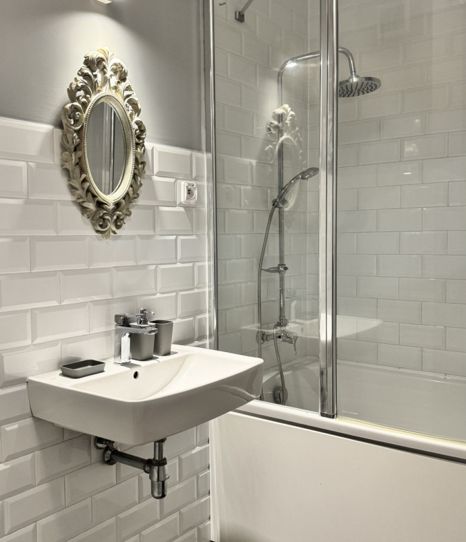 Łazienka z wanną/prysznicem, elegancka ceramika i armatura.
