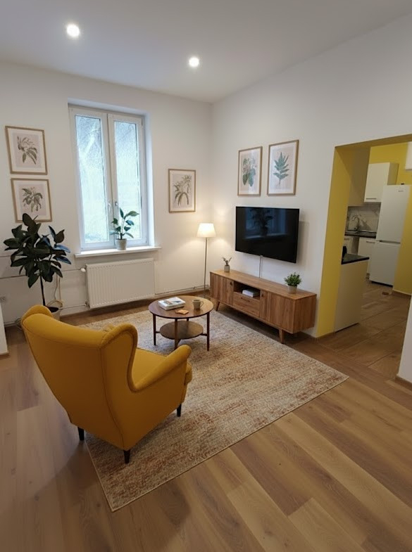 • 2 ustawne pokoje (12,3 m² i 11,69 m²) – sypialnia + salon lub gabinet