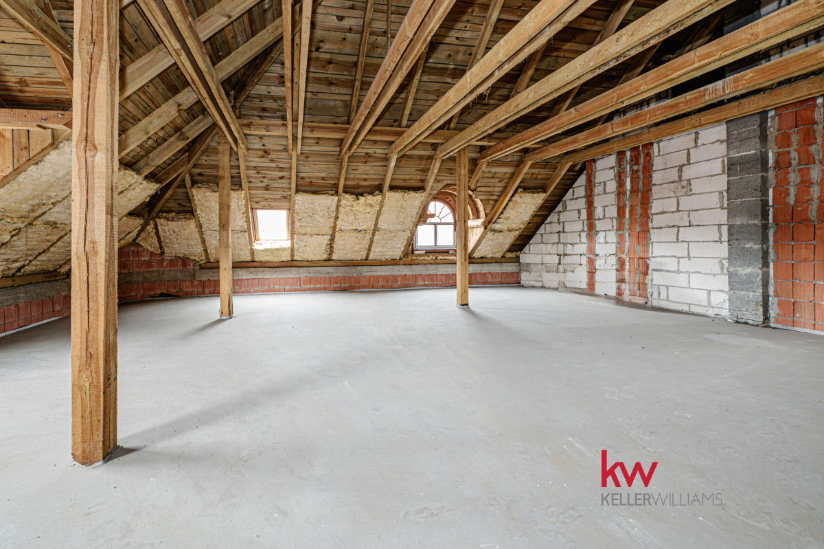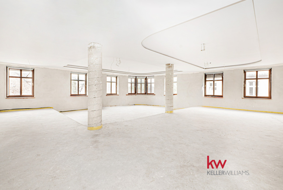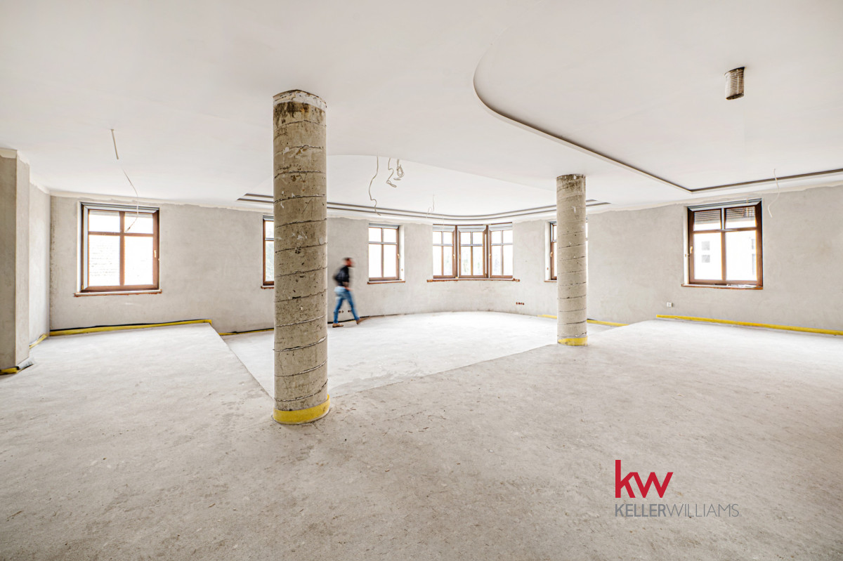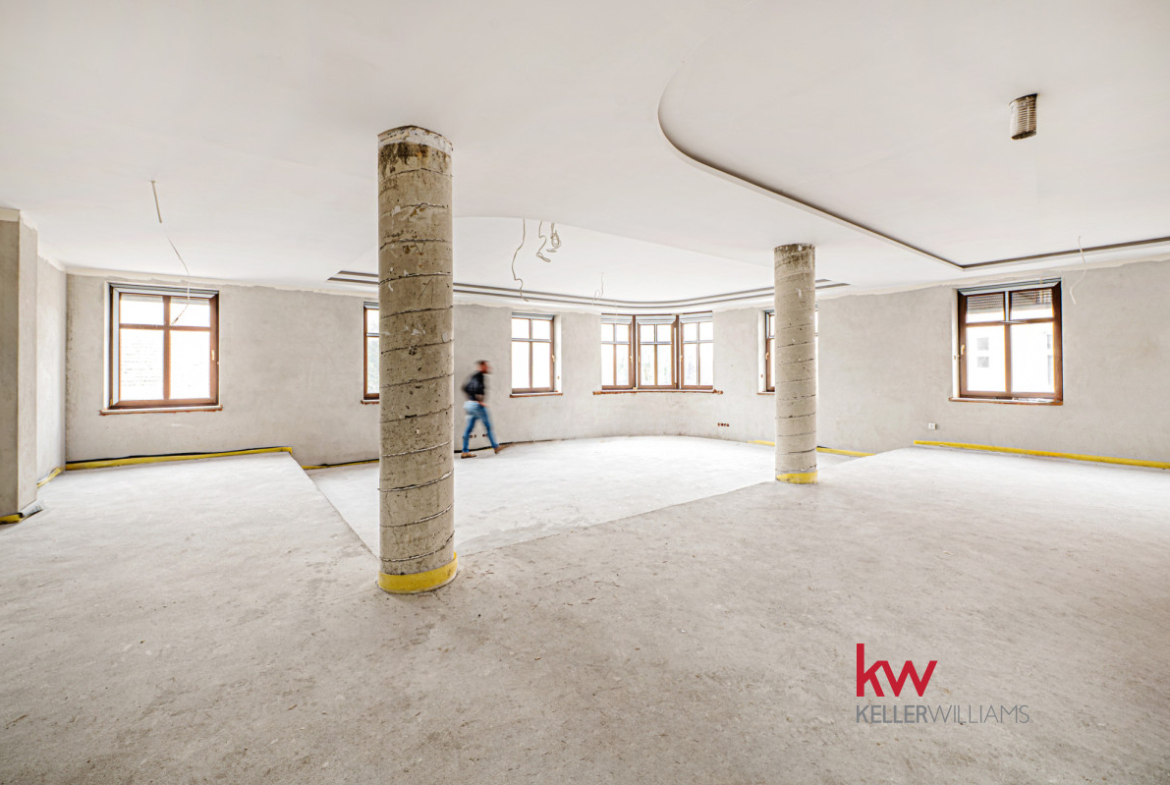 Poddasze (209,82 m²): przestrzeń do wykończenia, z pięknymi półokrągłymi oknami – idealna na mieszkania, biura lub apartamenty inwestycyjne.