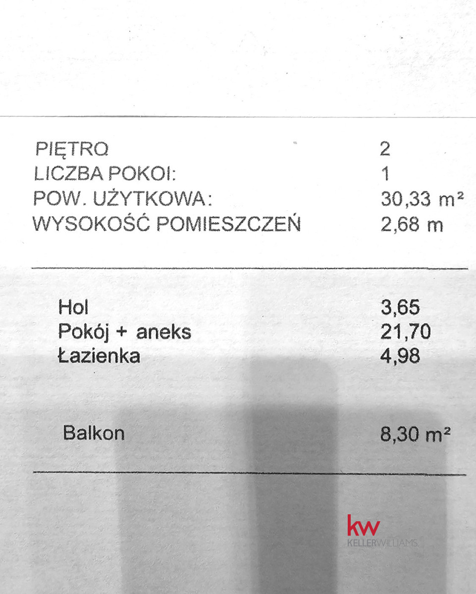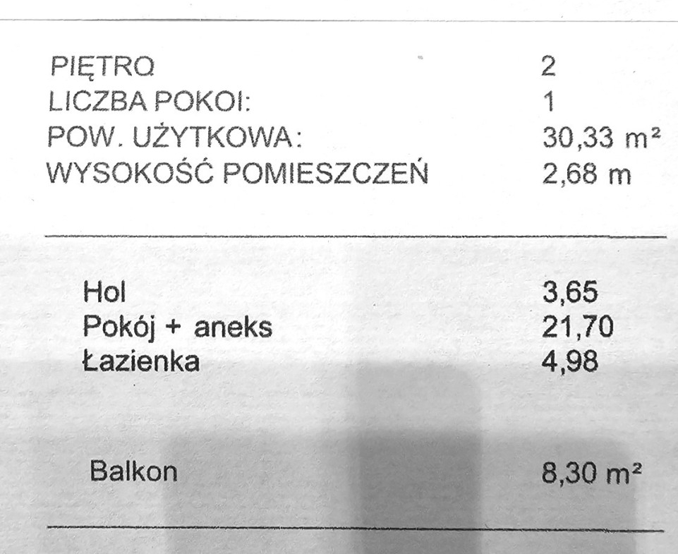 Oferuję komfortowy, jednopokojowy apartament na drugim piętrze o powierzchni 30,19 m2 z dużym balkonem o pow. 8.30 m2 .