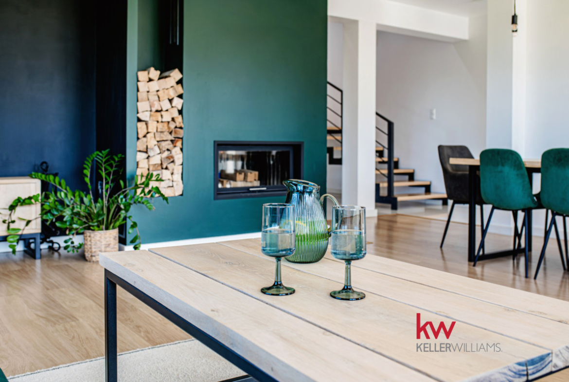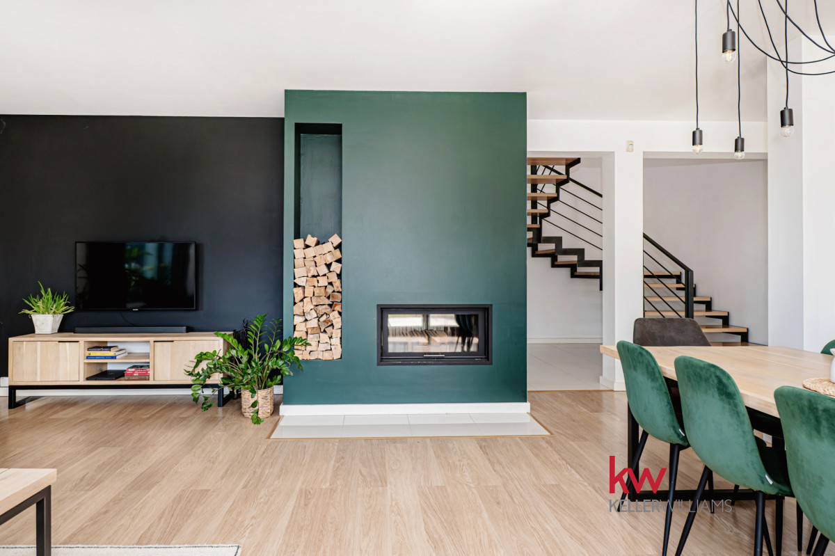 Przestronny salon z kominkiem i otwartą kuchnią – serce domu z bezpośrednim wyjściem na taras i ogród.