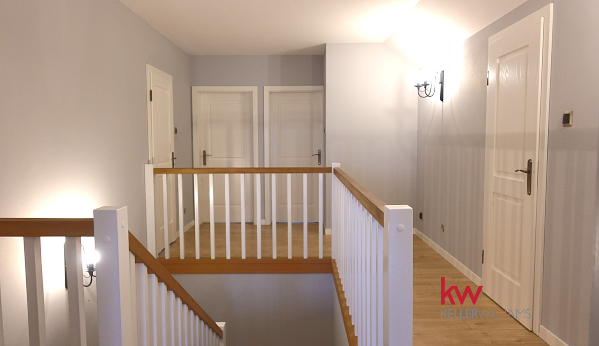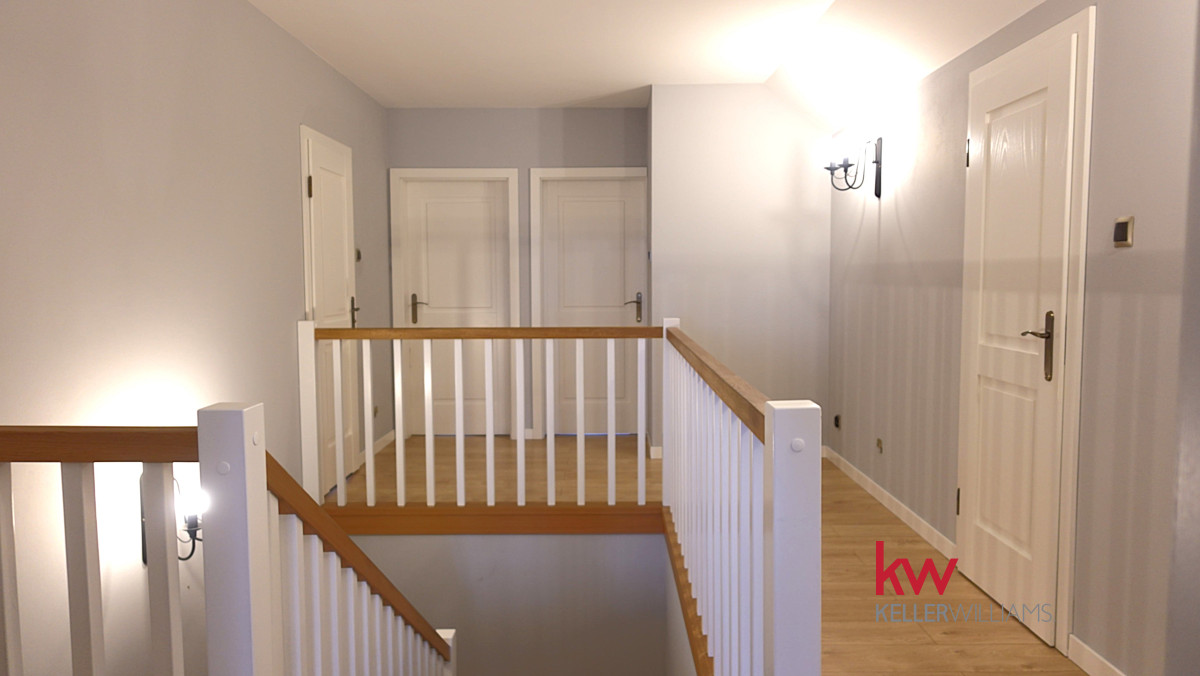 – Piętro: ok. 120 m² – główna sypialnia z prywatną łazienką, 2 sypialnie, łazienka i pralnia