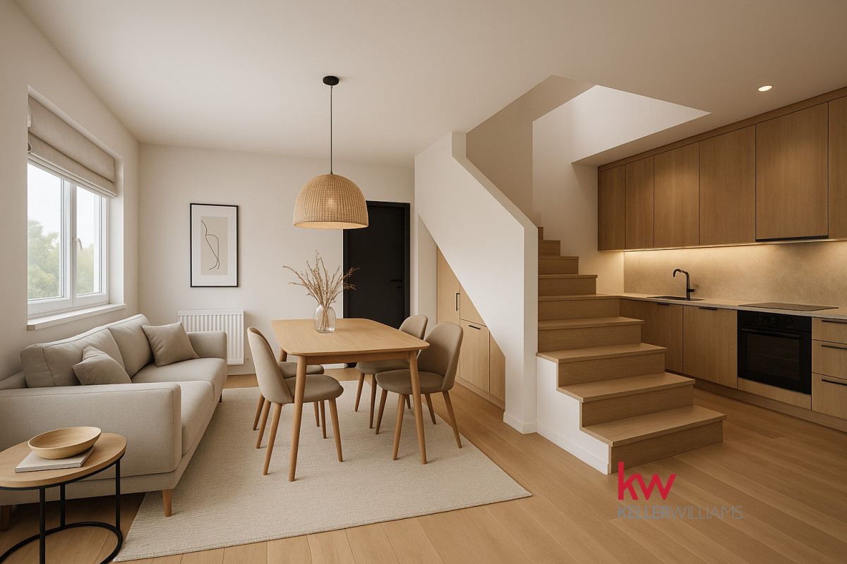 Na parterze mamy przestronny salon połączony z kuchnią, wyjście na taras, oraz toaletę.