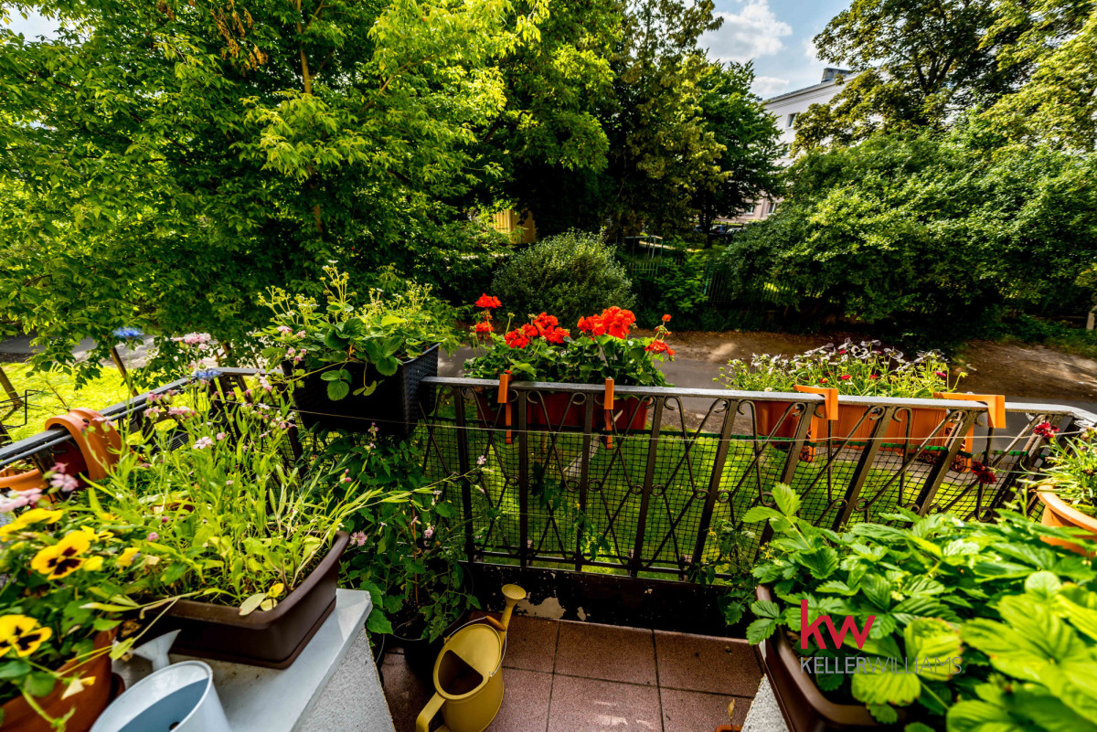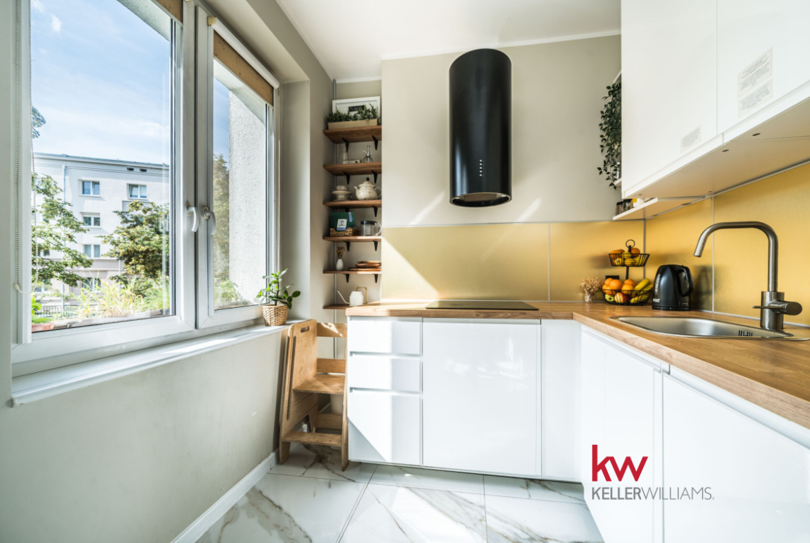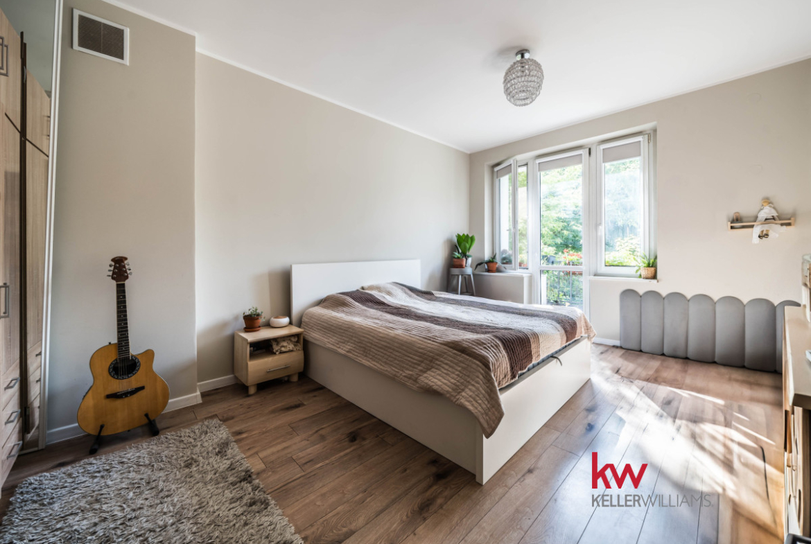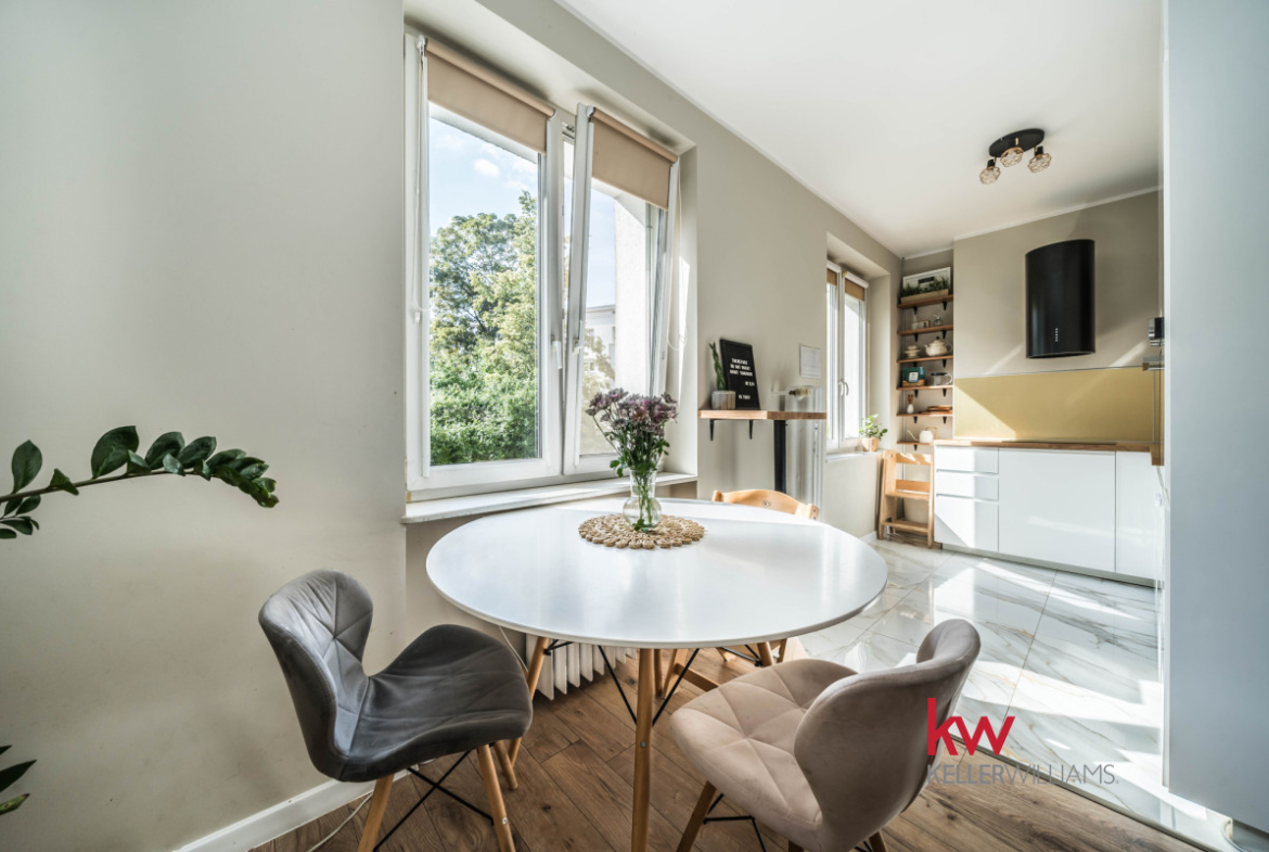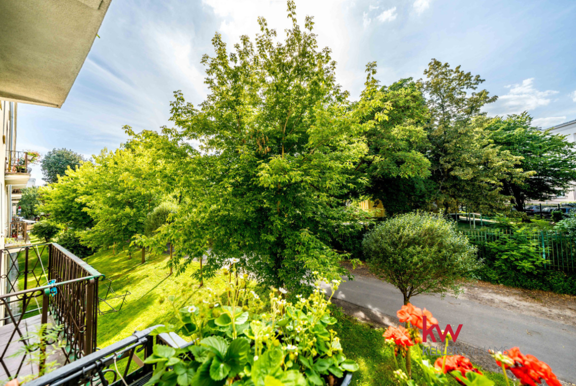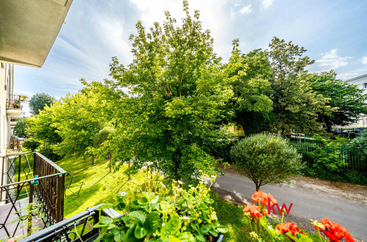 Okna wychodzą na stronę zachodnią, a za oknami cisza i zielony skwer z drzewami.