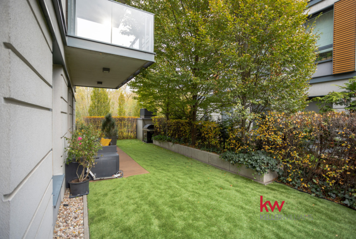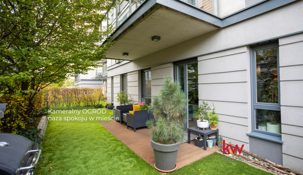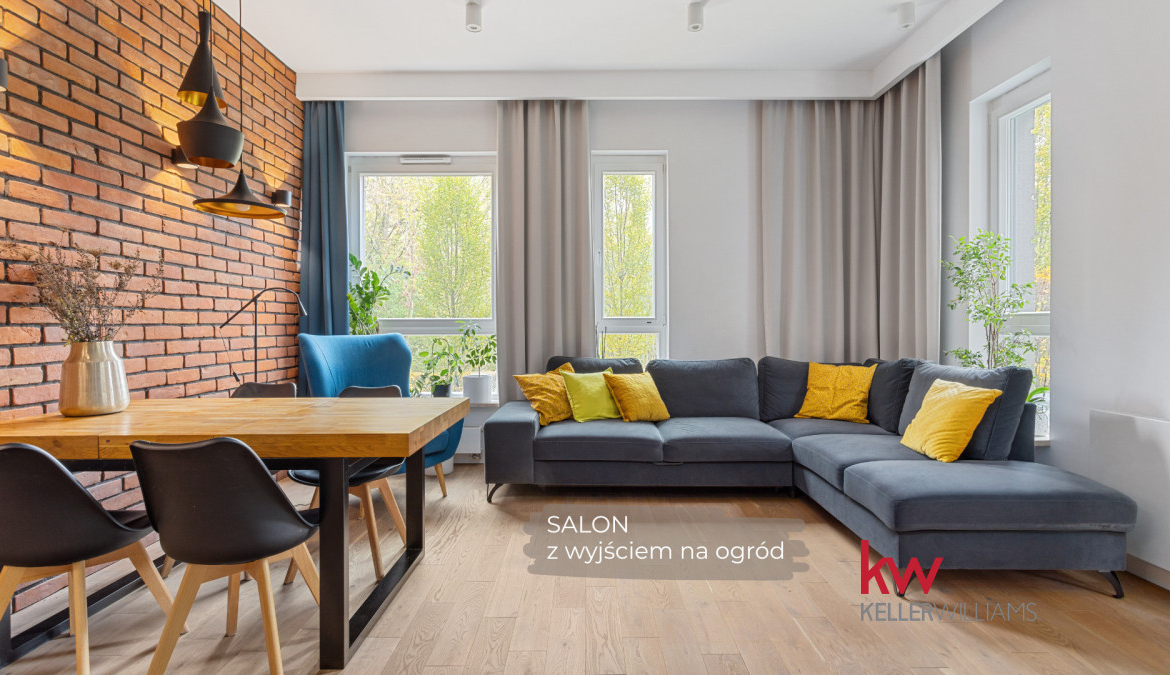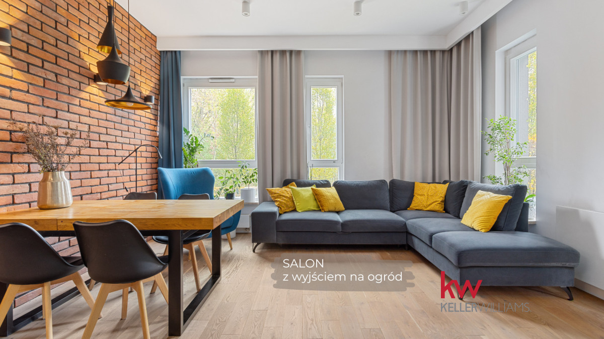 Z salonu wychodzisz bezpośrednio do prywatnego, zielonego ogródka otoczonego krzewami, który w okresie wiosenno-letnim jest naturalnym przedłużeniem części dziennej.