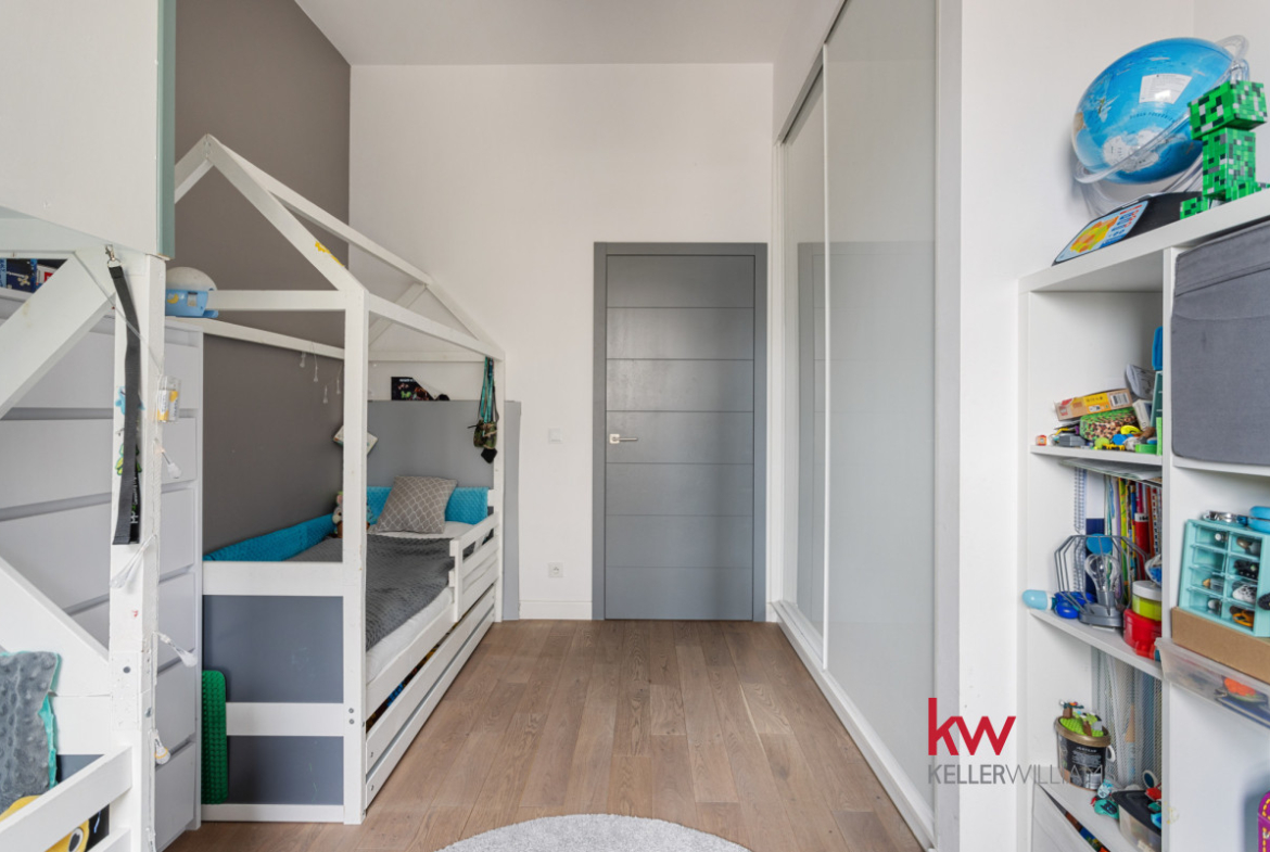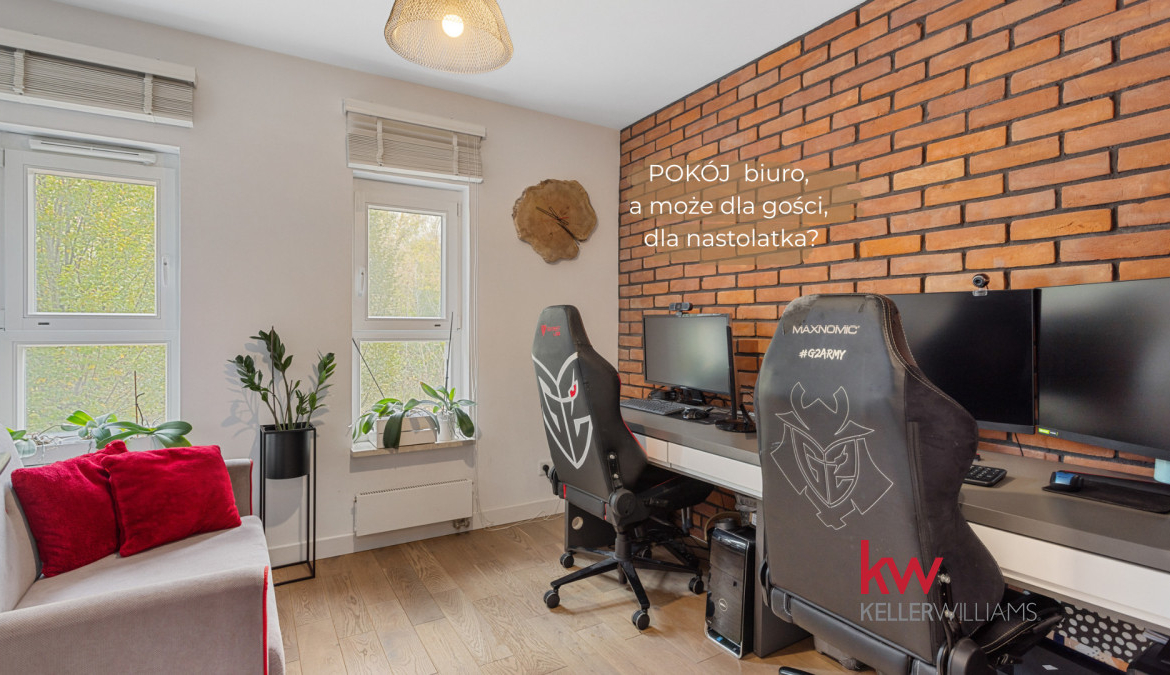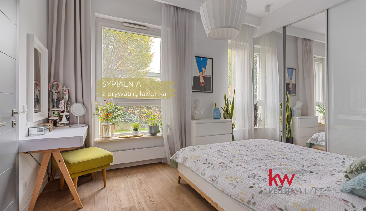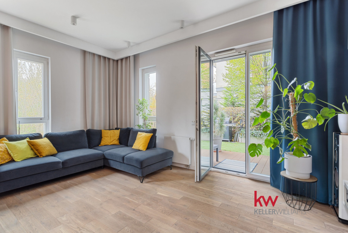 Z salonu wychodzisz bezpośrednio do prywatnego, zielonego ogródka otoczonego krzewami, który w okresie wiosenno-letnim jest naturalnym przedłużeniem części dziennej.
