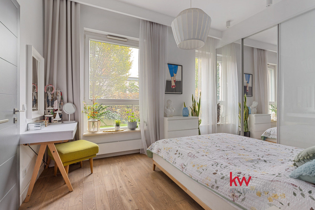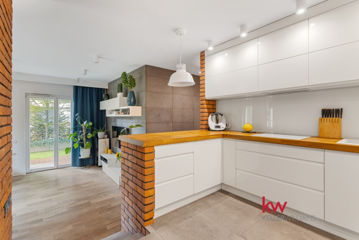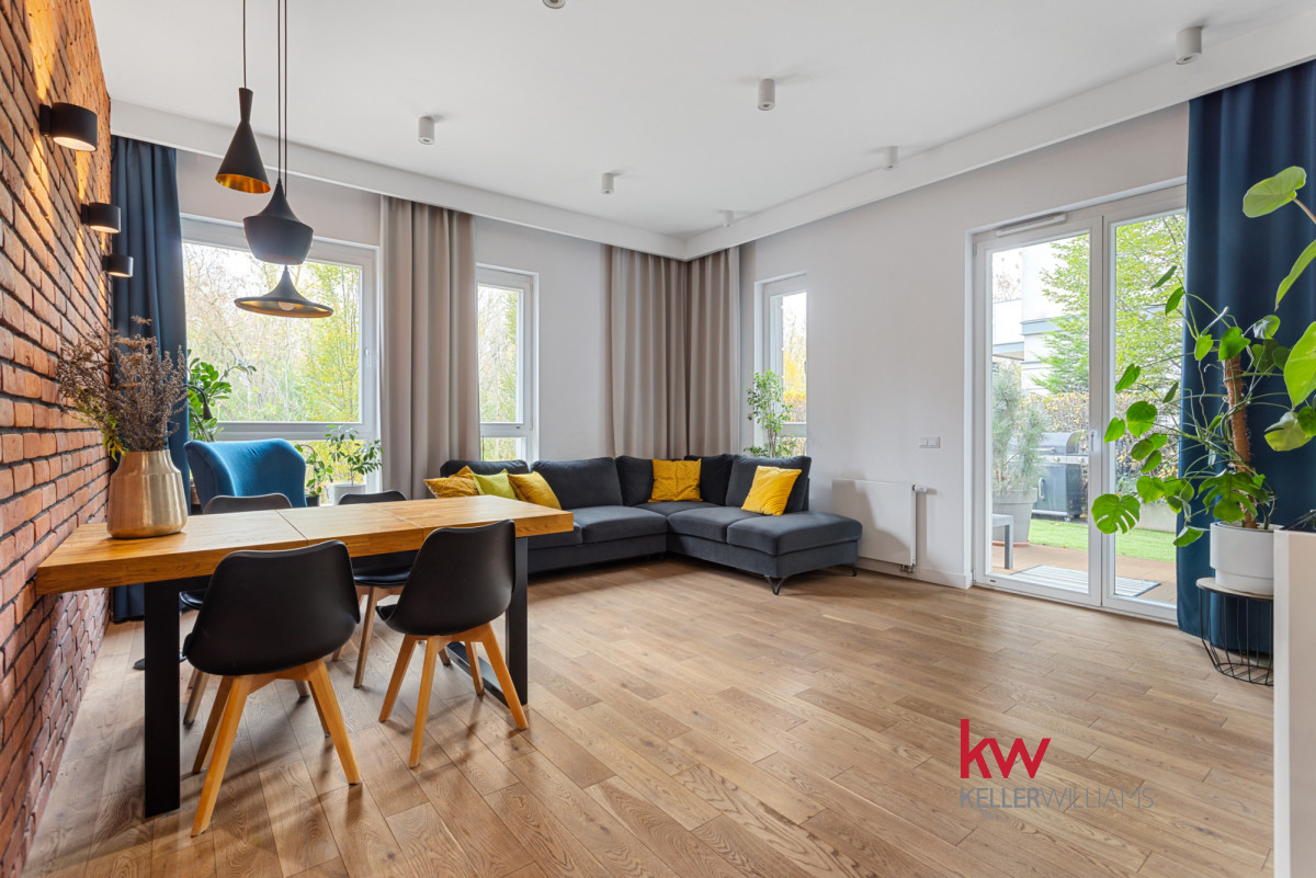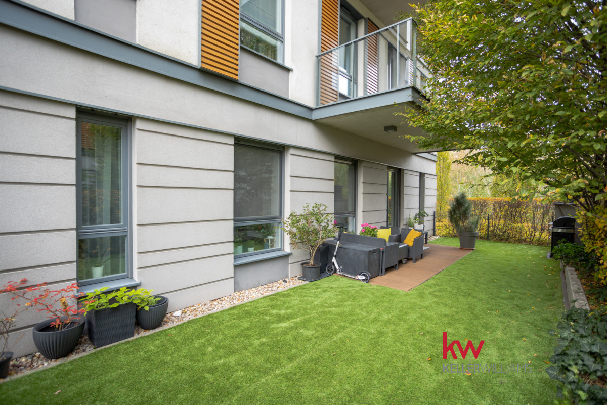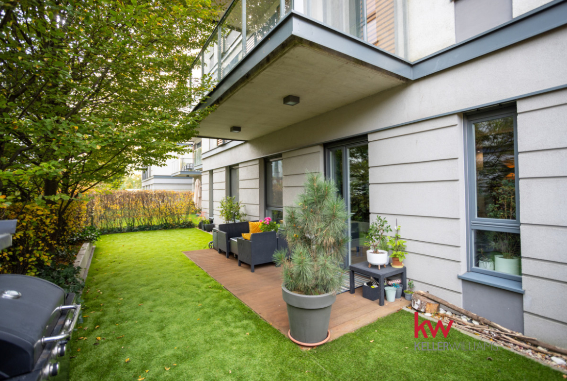 Z salonu wychodzisz prosto do zielonego ogródka otoczonego krzewami, co zawsze daje poczucie prywatności.