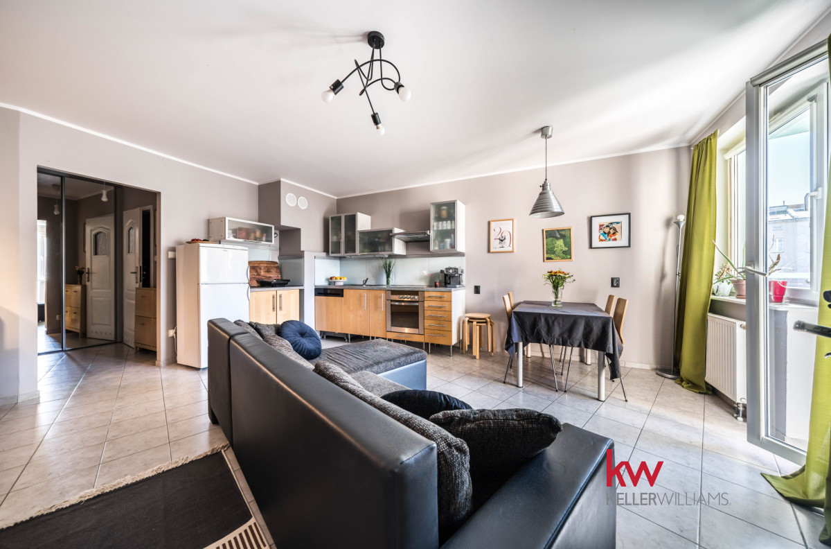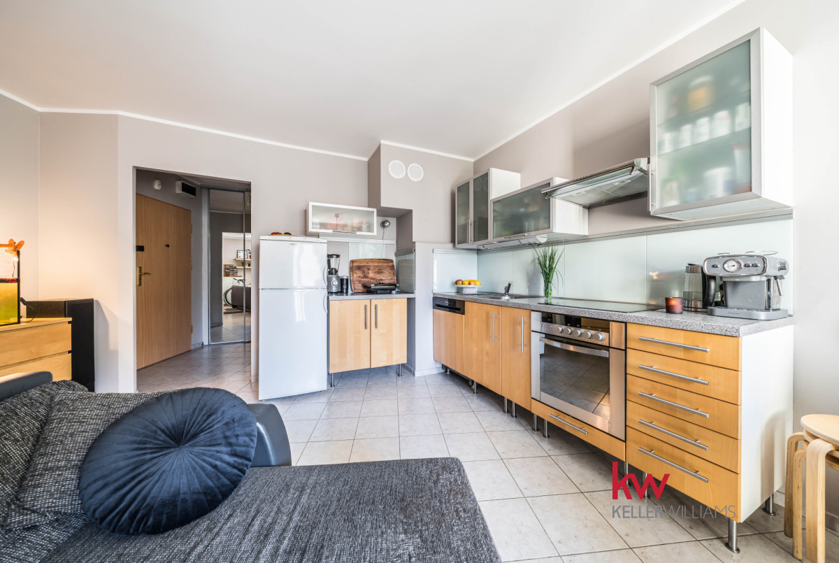 – 25.3 m2 przestronny salon z kuchnią z wyjściem na balkon – idealne miejsce na poranną kawę lub relaks po pracy,