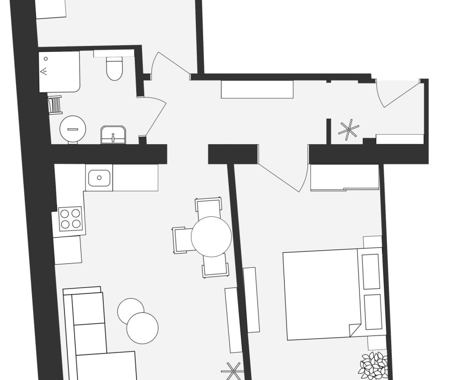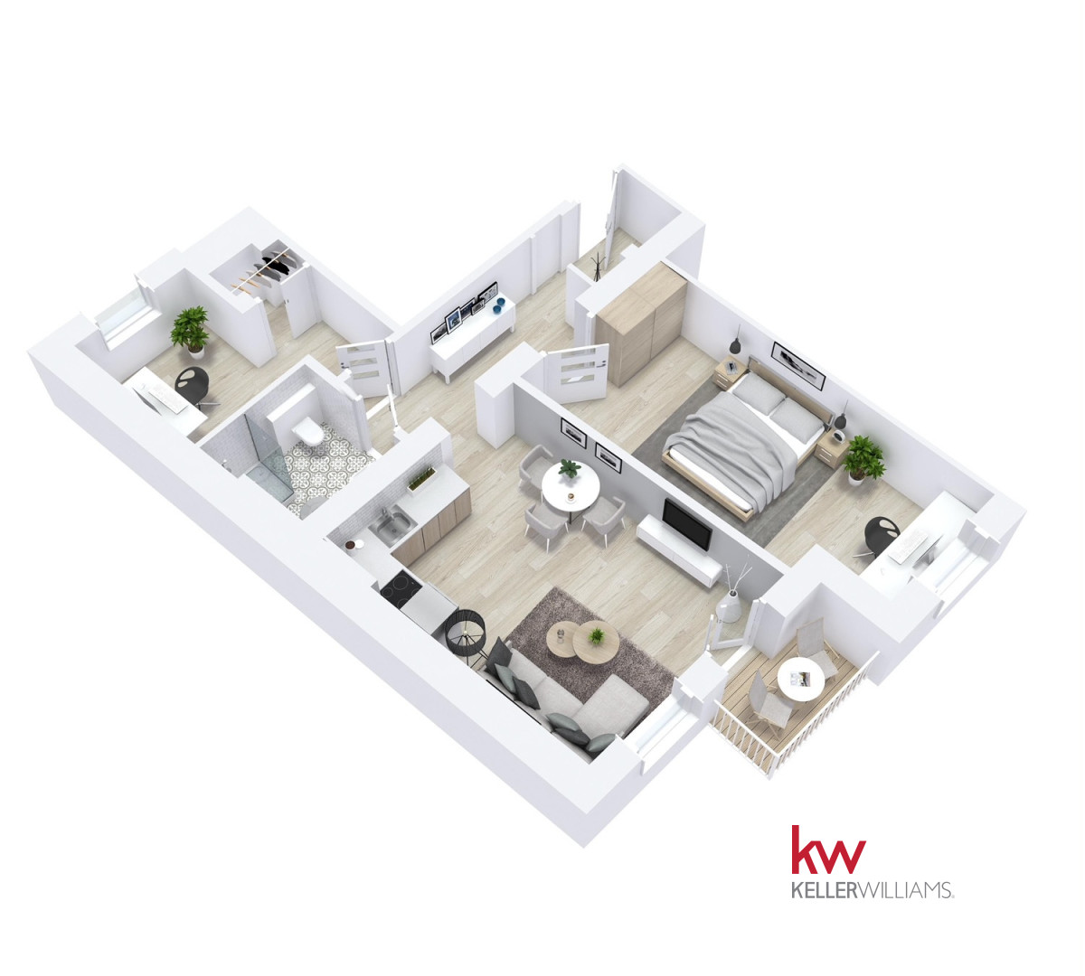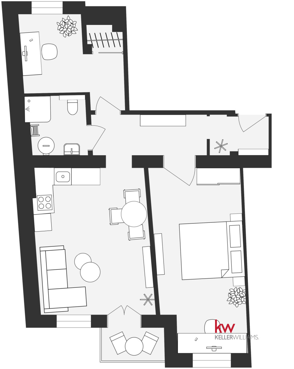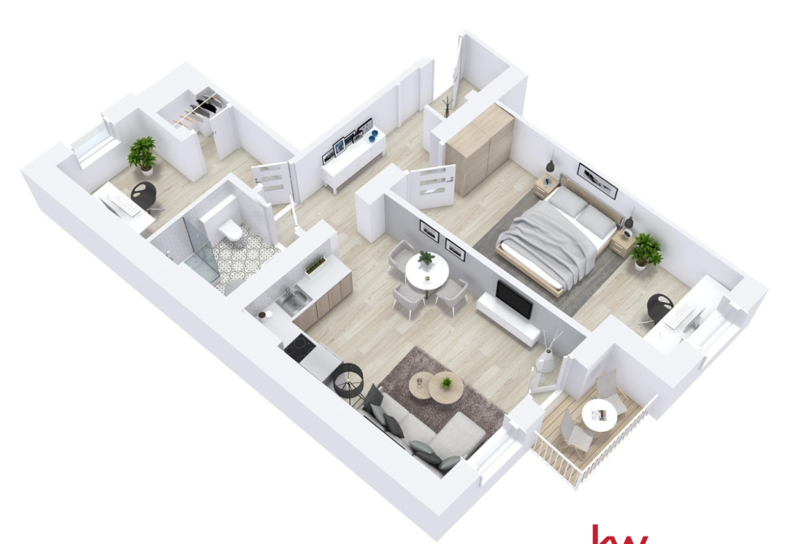 Wizualizacja przedstawia zmiany, dzięki którym aneks kuchenny można umieścić w dużym pokoju, zyskując tym samym mały gabinet. Mieszkanie jest bardzo dobrze doświetlone, dzięki dużym oknom. Wysokość pomieszczeń to 3 metry. Okna z obu pokoi wychodzą na stronę południową, z gabinetu na północny – wschód. Mieszkanie posiada balkon. Sąsiedztwo to osoby w większości młode.