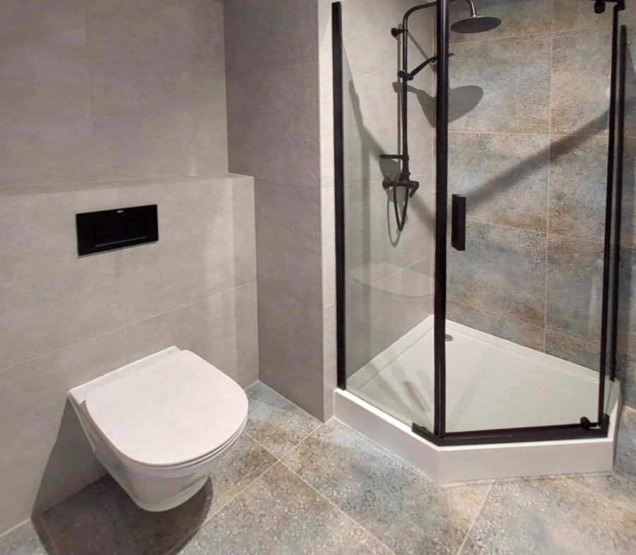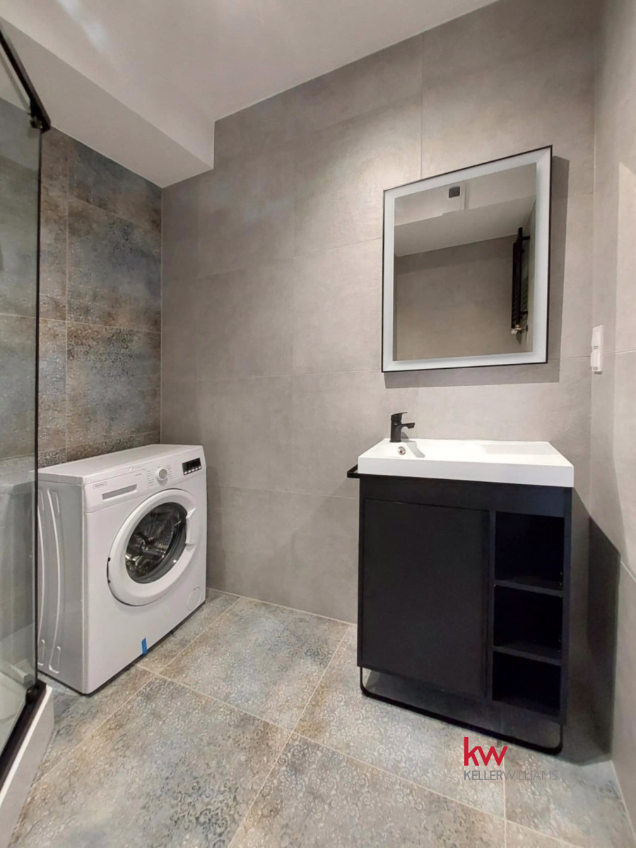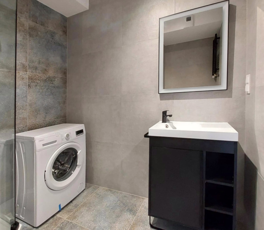 * Duża łazienka w eleganckich hiszpańskich kafelkach, wyposażona w kabinę prysznicową i nową pralkę.