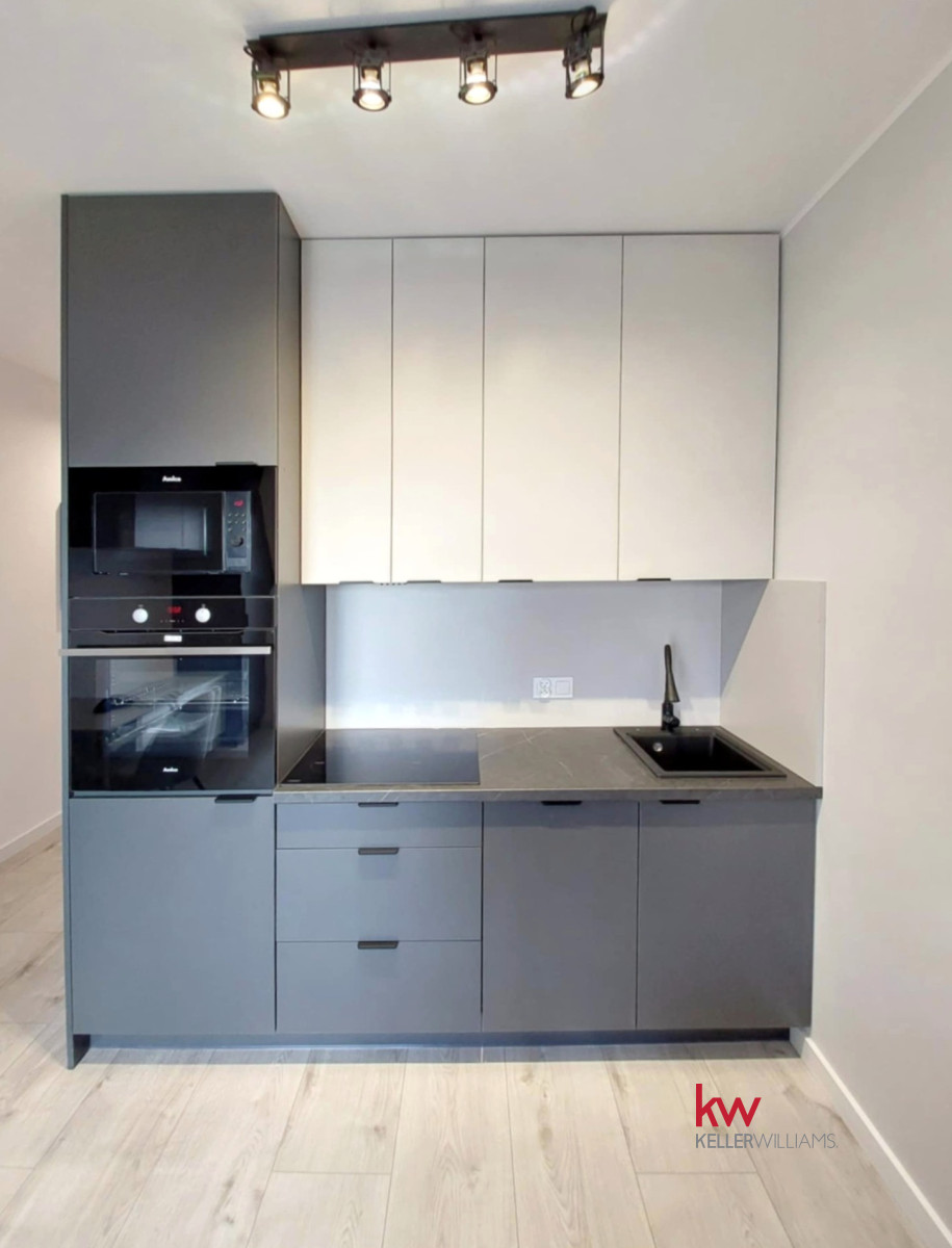 Kuchnia w pełni umeblowana i wyposażona w sprzęt AGD najwyższej klasy: lodówkę, piekarnik, mikrofalówkę oraz zmywarkę – wszystko NOWE i na gwarancji!
