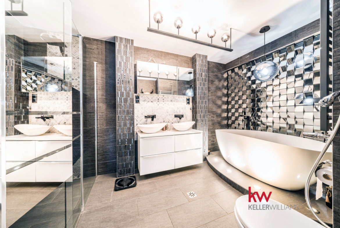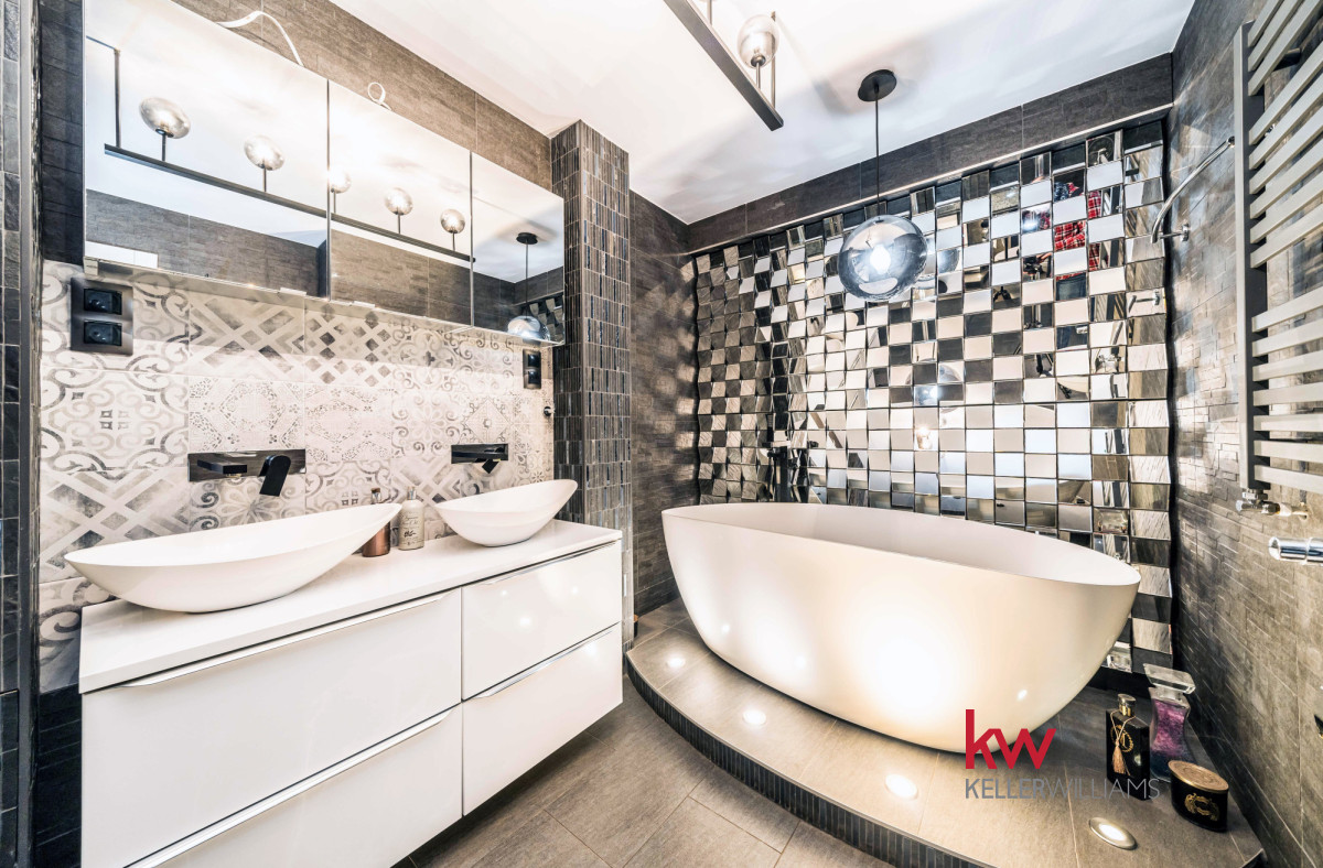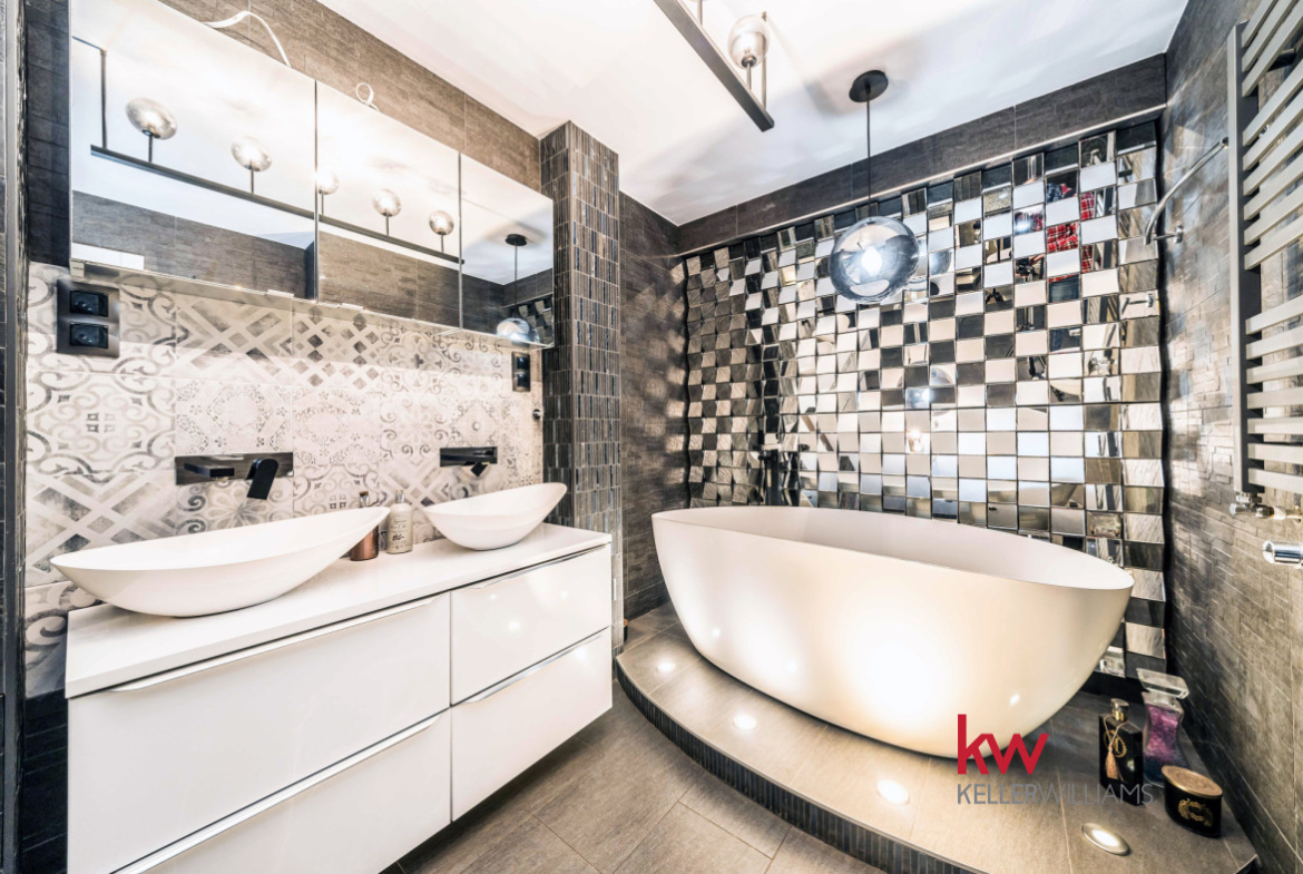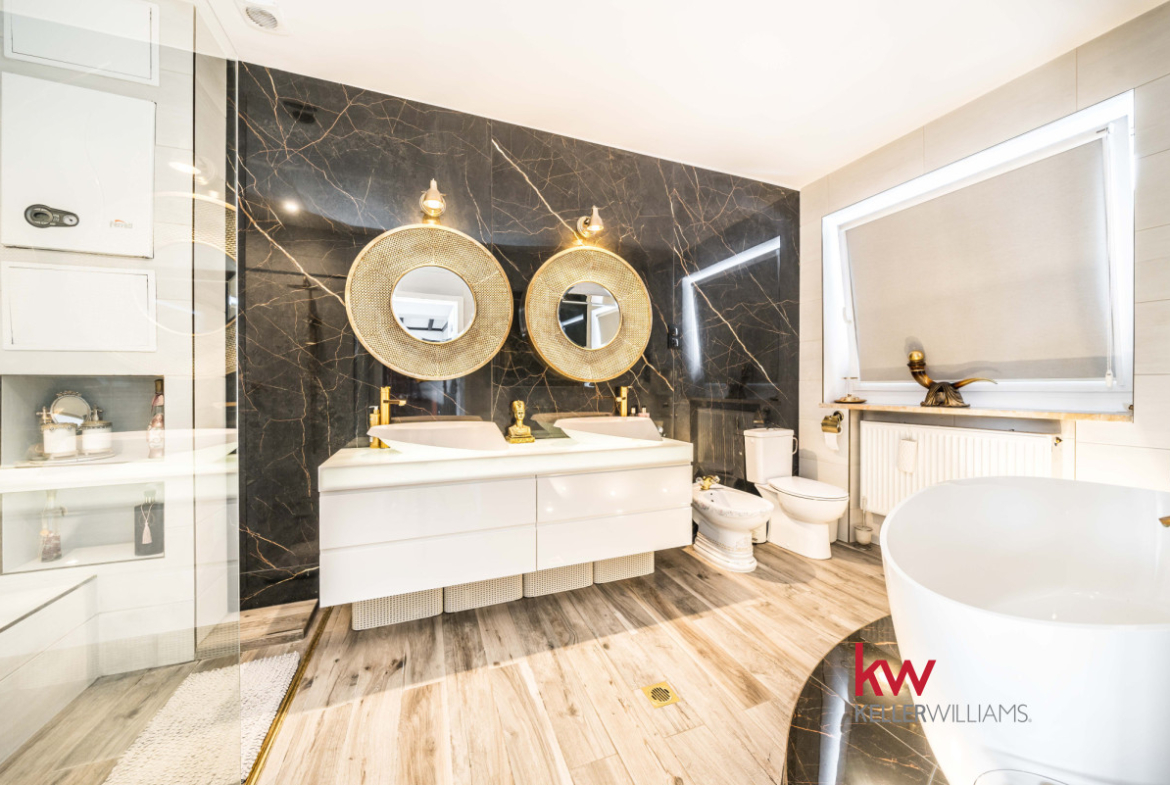 ✔ Łazienka z wyposażeniem premium (baterie pokryte 24-karatowym złotem, wanna i umywalki z lanego marmuru Marmorin, wysokiej jakości armatura i płytki z Australii)