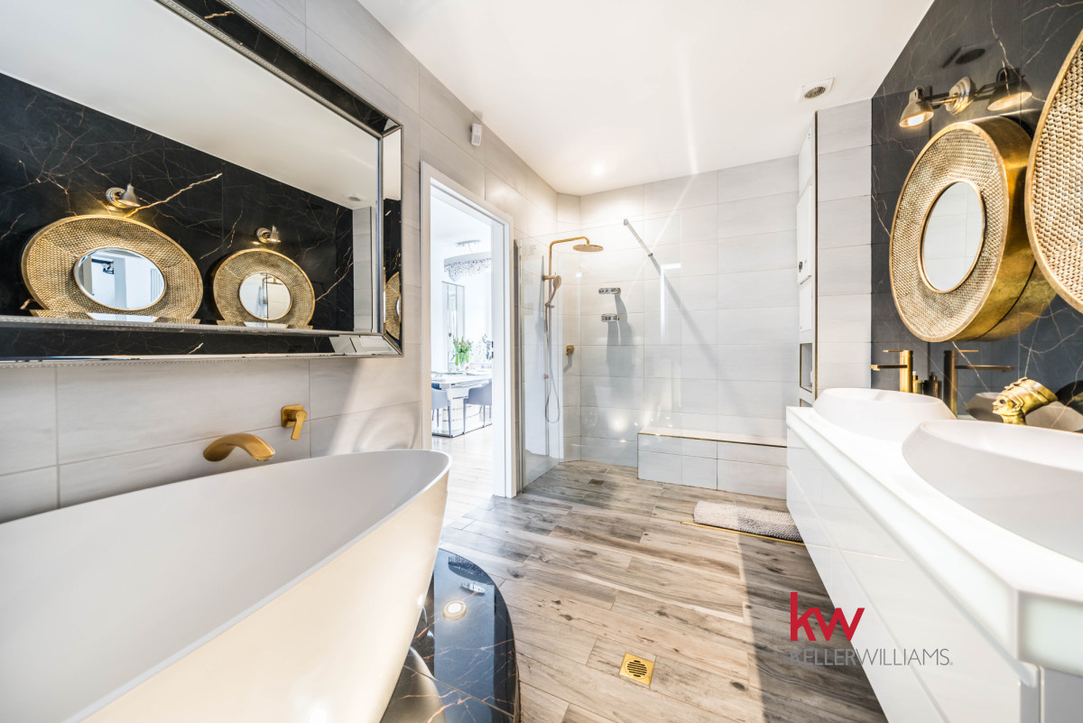 ✔ Duża łazienka z wanną wolnostojącą, dwustanowiskową kabiną prysznicową, z odpływem liniowym, dwoma umywalkami nadblatowymi