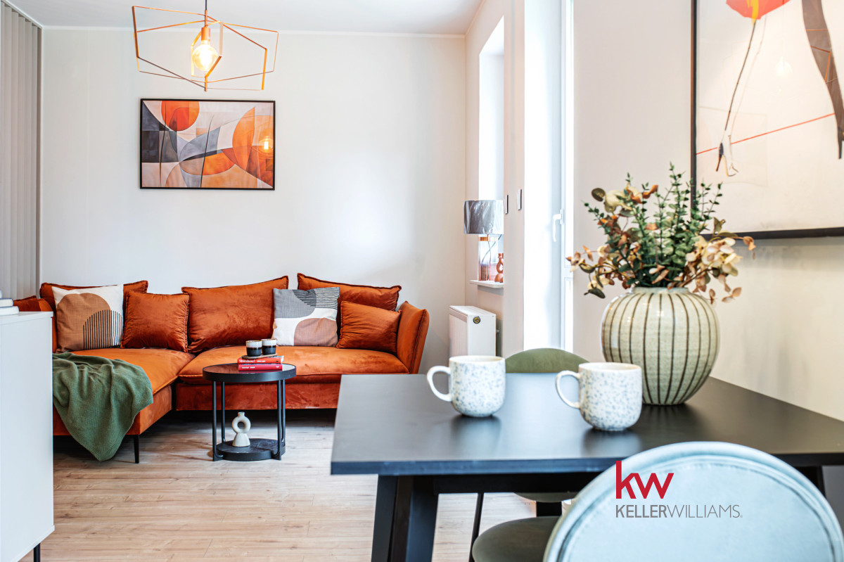 - jasna część dzienna z wygodną sofą i wyjściem na balkon z widokiem na zieleń,