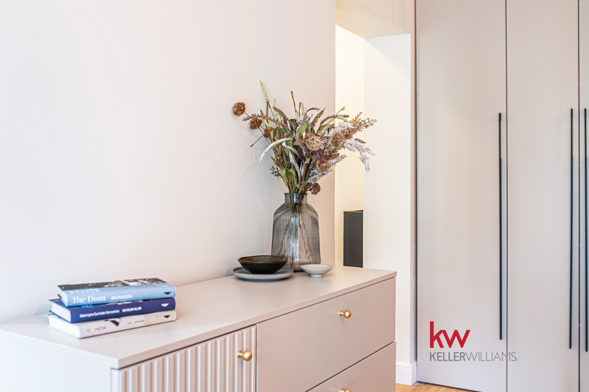 - elegancki przedpokój z dużym lustrem, komodą i szafką na buty