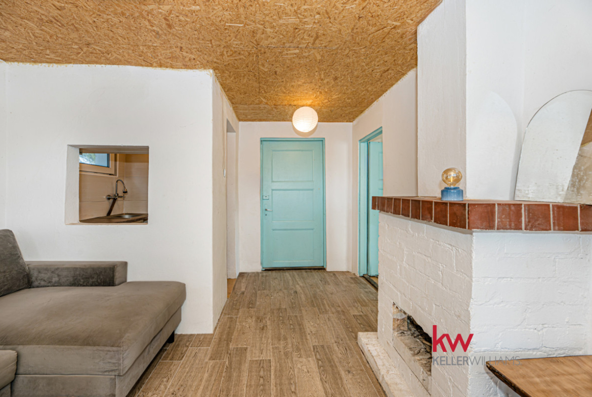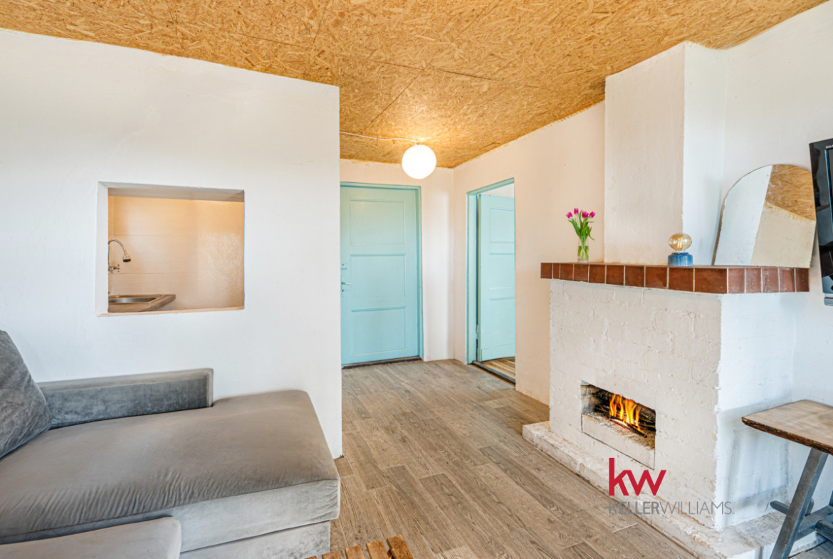 Salon z kominkiem to serce tego domku 🙂