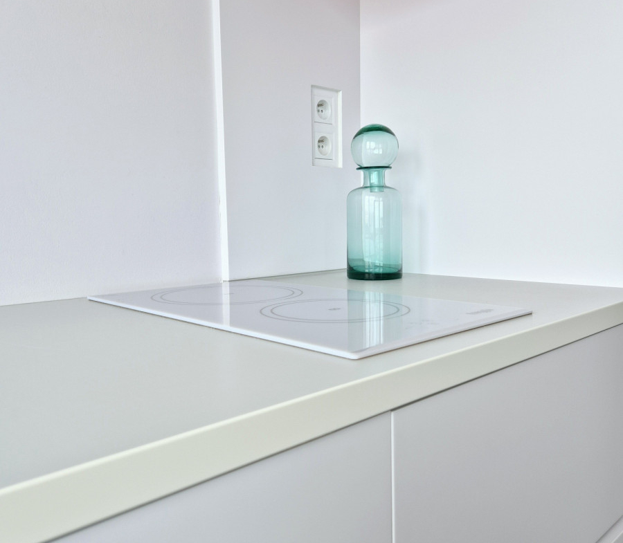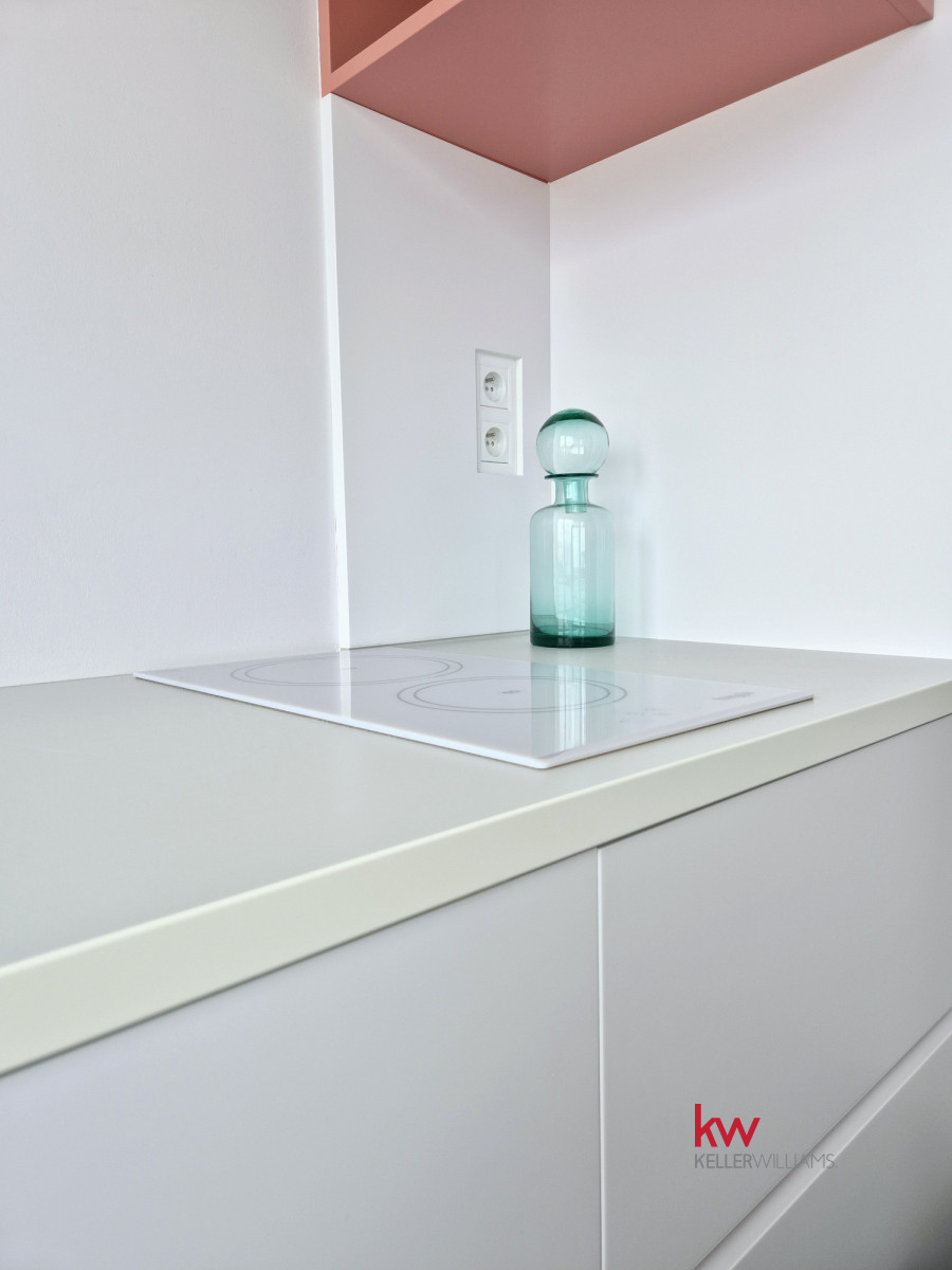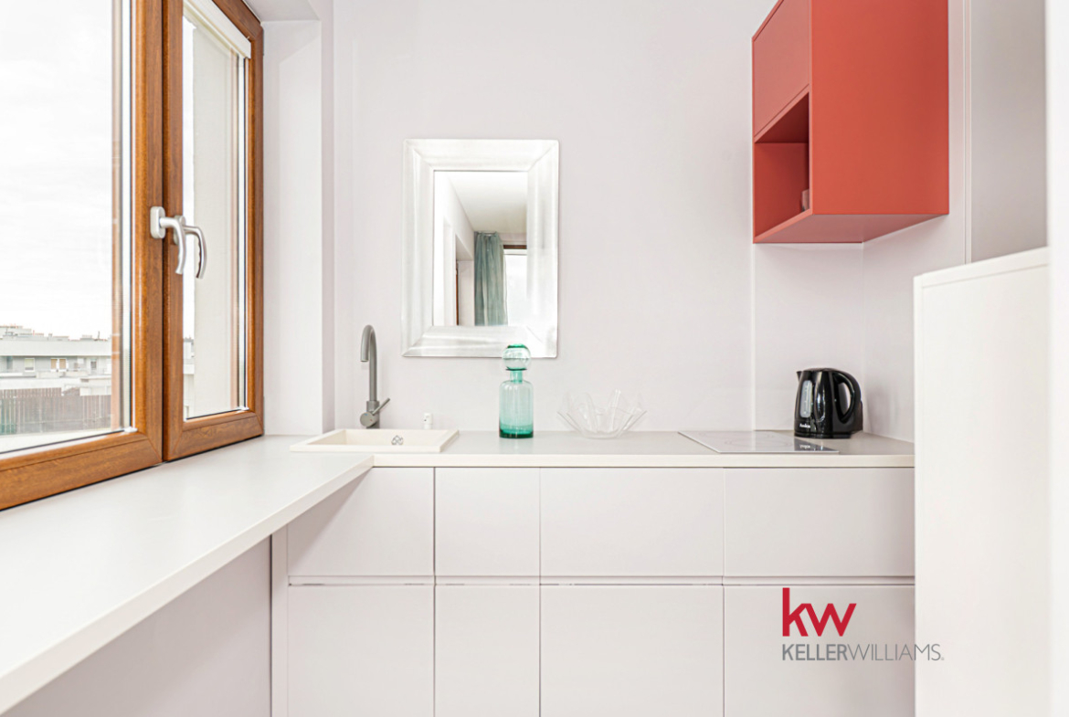 ● Funkcjonalna kuchnia w zabudowie lakierowanej na mat z dużym oknem, kamiennym zlewozmywakiem i włoską płytą indukcyjną + sprzęt AGD