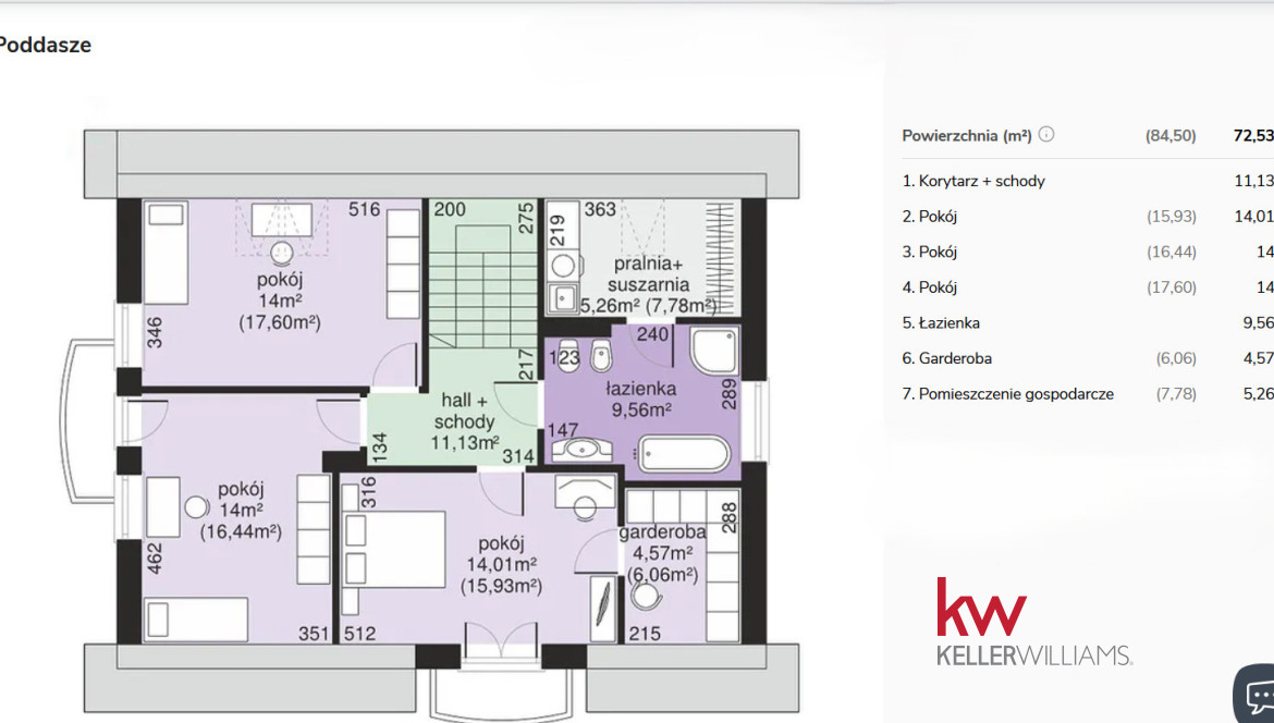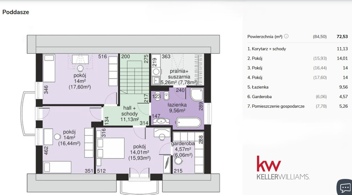 Poddasze: 84,50 m2 72,53 m2 ( bez skosów)