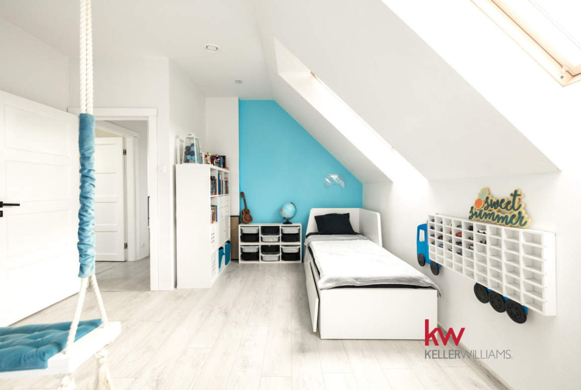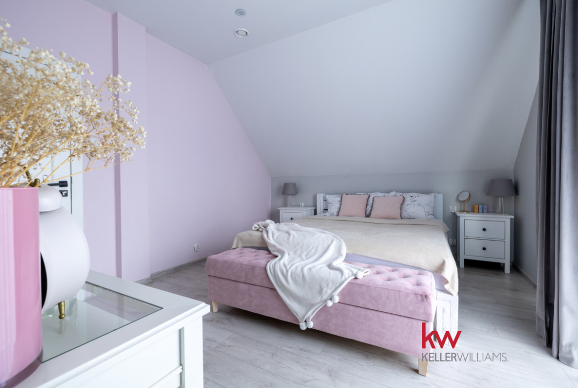 STREFA PRYWATNA (Piętro): Trzy komfortowe sypialnie. Główna sypialnia to prawdziwy atut – z własną, pojemną garderobą i prywatnym tarasem, zapewniającym relaks na świeżym powietrzu ale i nietuzinkowe doznania.