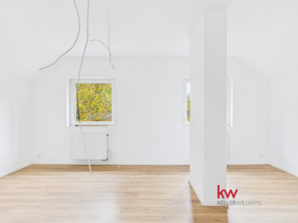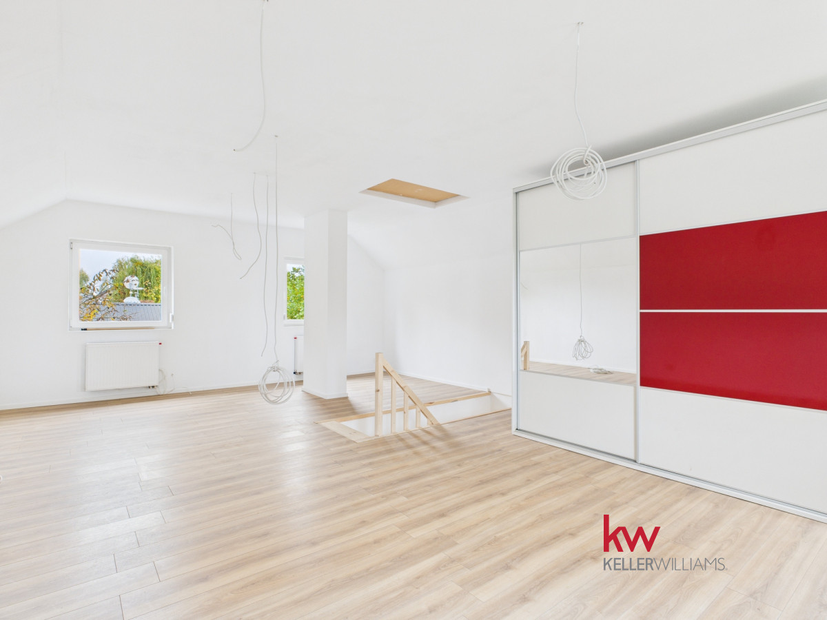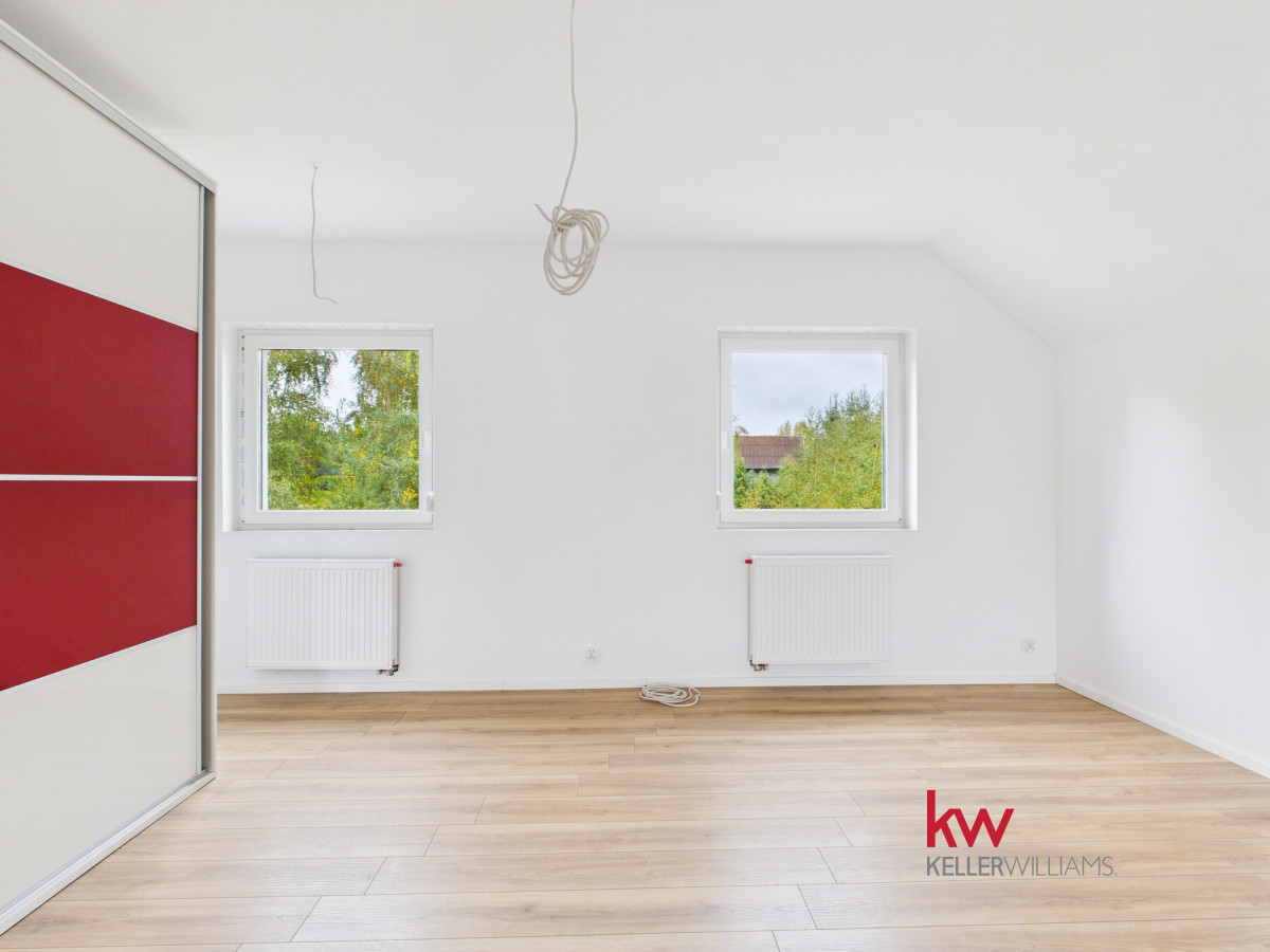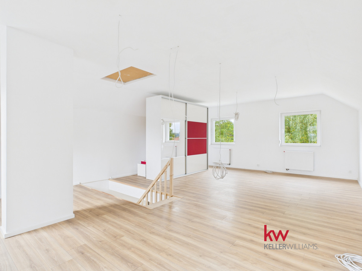• Piętro to obecnie jedna, przestronna przestrzeń, którą można łatwo zaaranżować według własnych potrzeb. Przygotowana instalacja elektryczna pozwala na wydzielenie trzech niezależnych pokoi i przedpokoju.