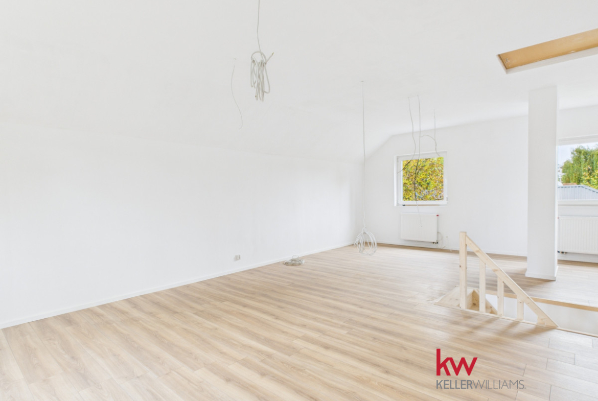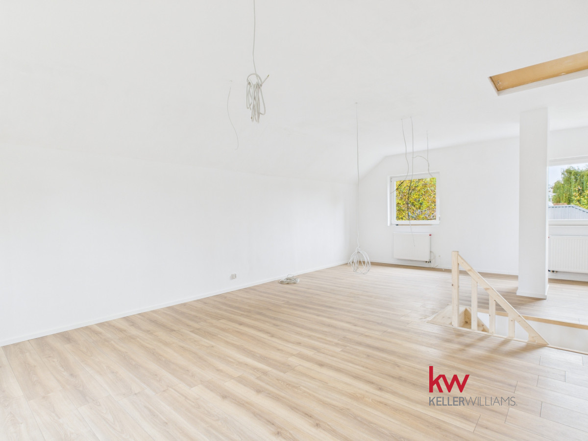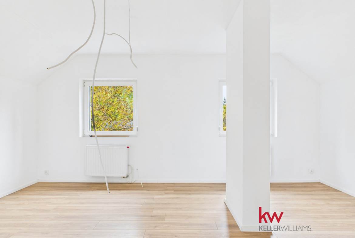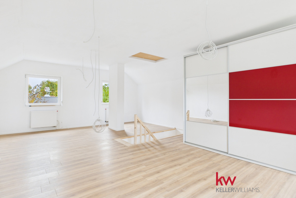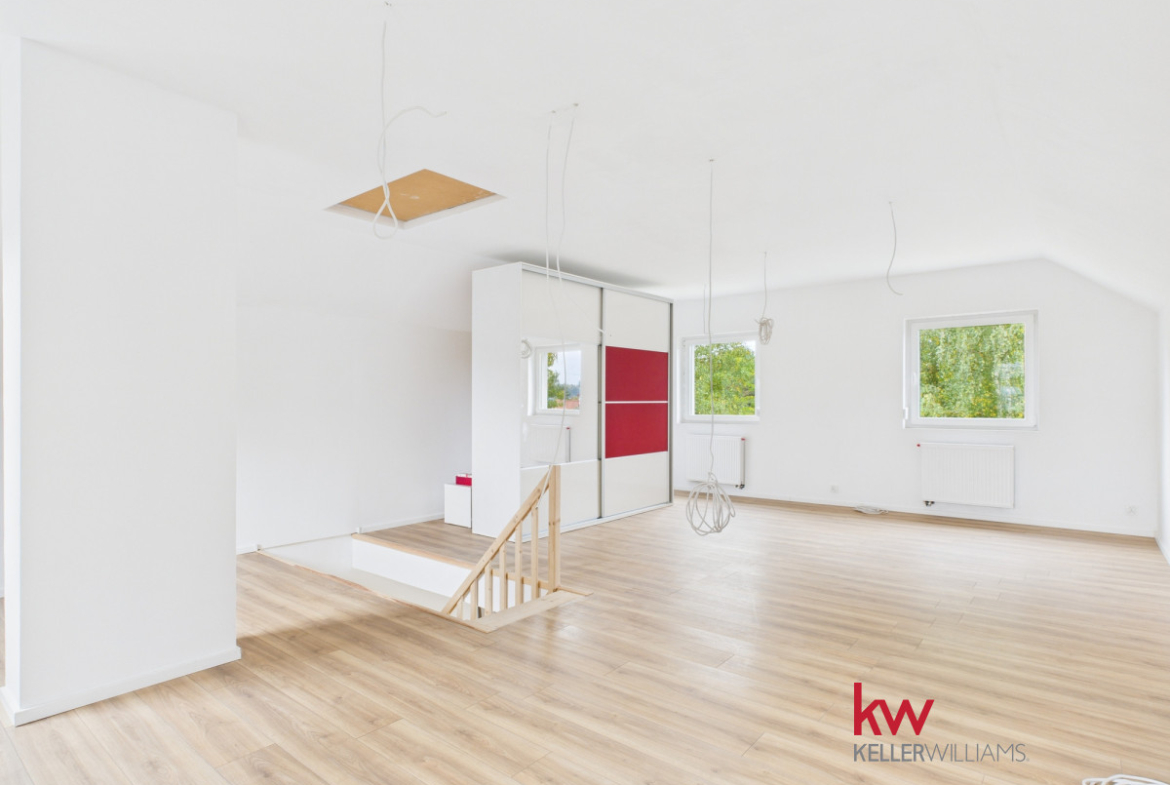 • Piętro to obecnie jedna, przestronna przestrzeń, którą można łatwo zaaranżować według własnych potrzeb. Przygotowana instalacja elektryczna pozwala na wydzielenie trzech niezależnych pokoi i przedpokoju.