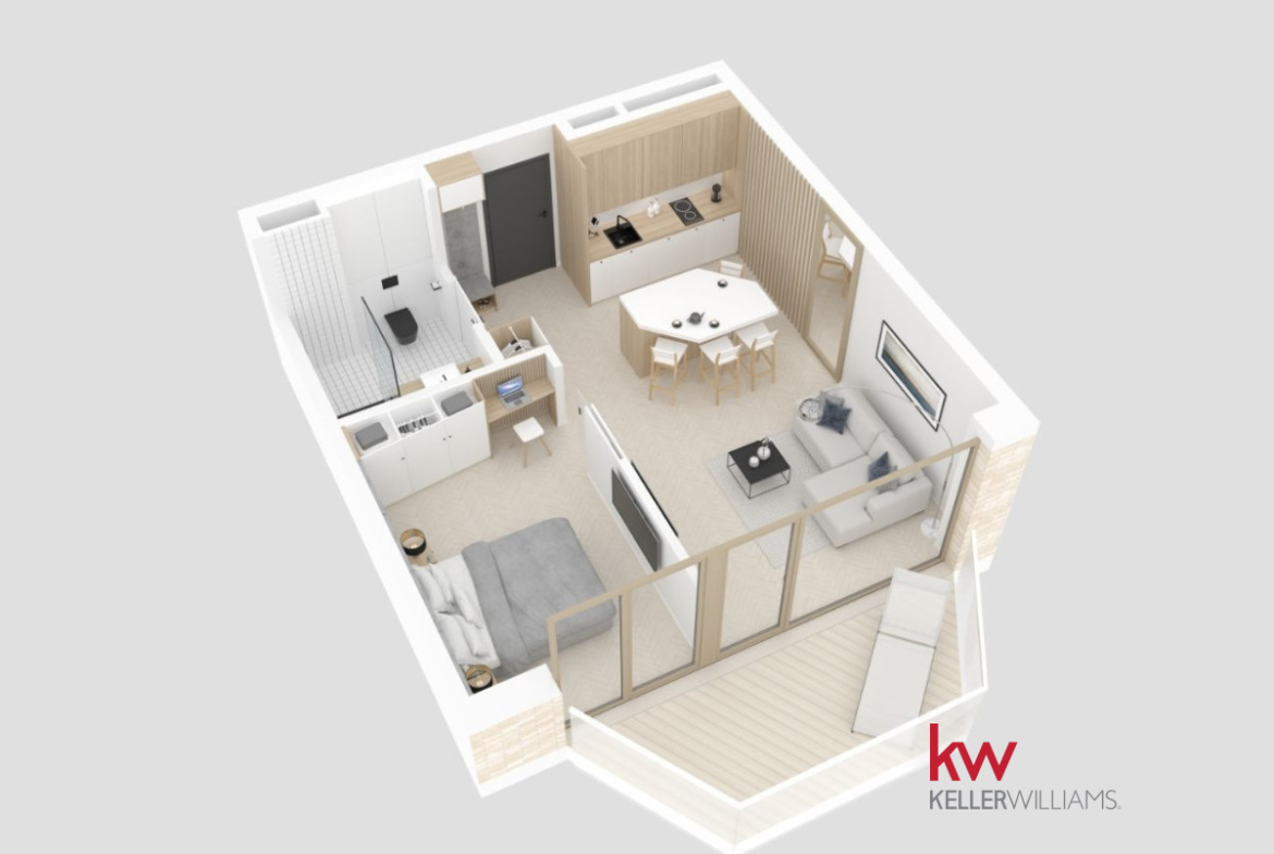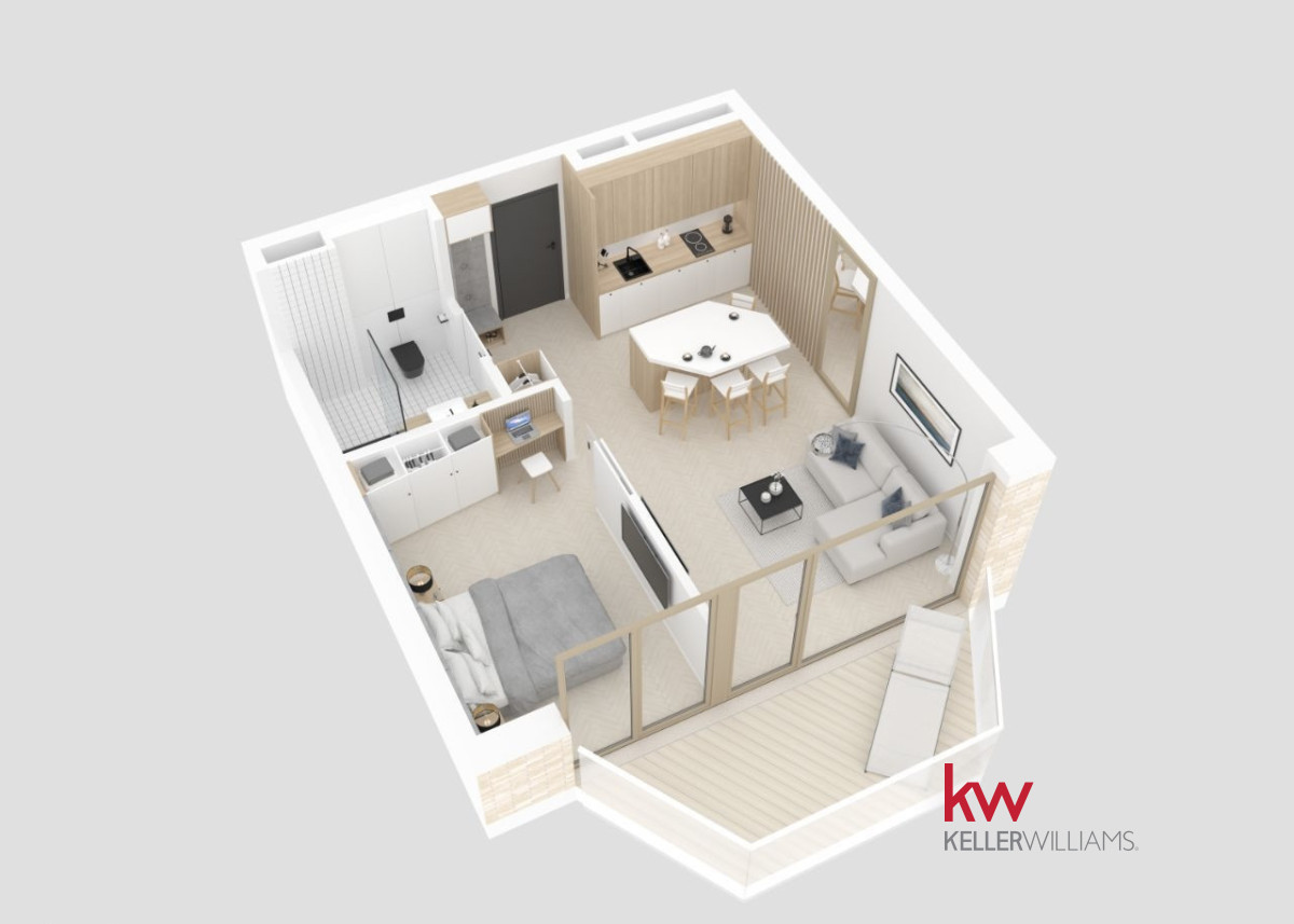 • Przestronnego salonu z aneksem kuchennym o powierzchni 22,16 m², z wyjściem na balkon (7,98 m2), z którego można cieszyć się świeżym powietrzem i otaczającą zielenią.