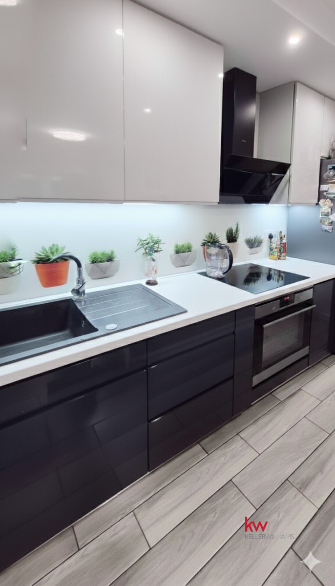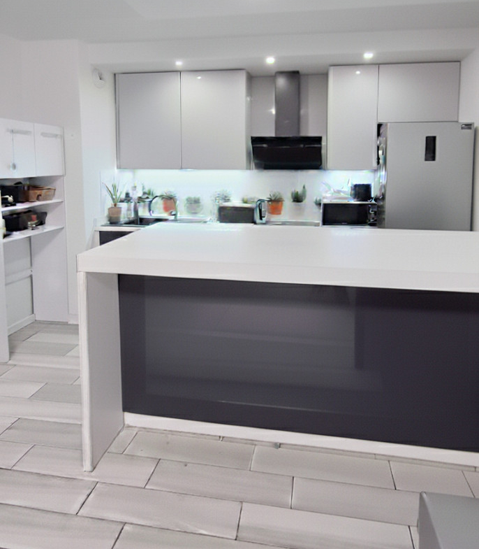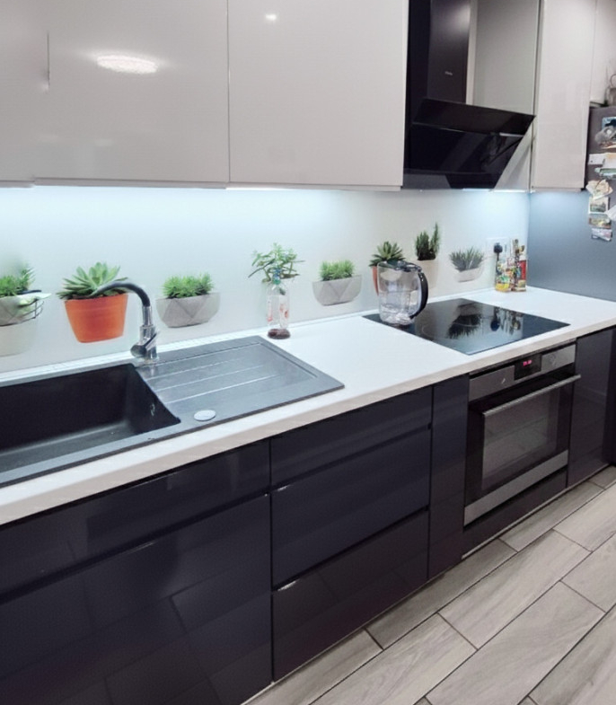 – kompletna, zabudowa kuchenna na wymiar w eleganckich kolorach bieli i ciemnego grafitu.