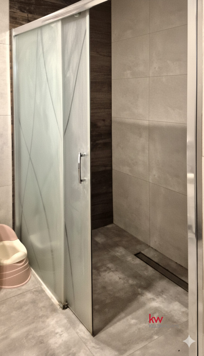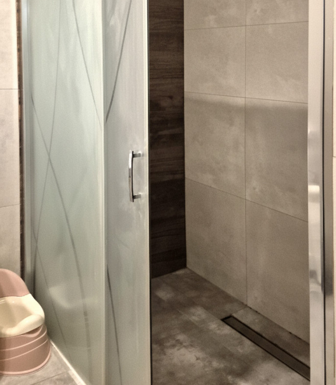 – duża, nowoczesna kabina prysznicowa typu walk-in z odpływem liniowym.