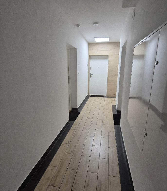 Mieszkanie jest wykończone w wysokim standardzie, utrzymane w nowoczesnej, spójnej estetyce (jasne podłogi imitujące drewno, biel i szarość na ścianach).